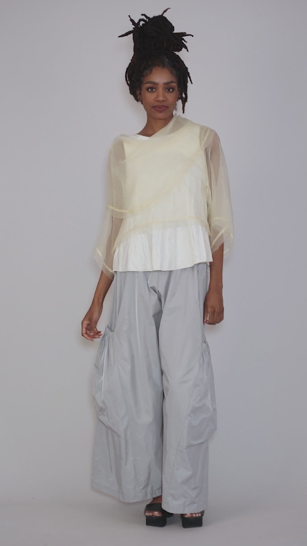Done in Planet's beloved silk organza fabric, a semi-sheer woven with a subtle sheen, Jackie O has an extravagant cowl neckline, full sleeves that end at the forearm and a cropped silhouette. The fit is quite relaxed, and this top's shorter length makes it an excellent layering partner, especially with higher-waisted skirts.