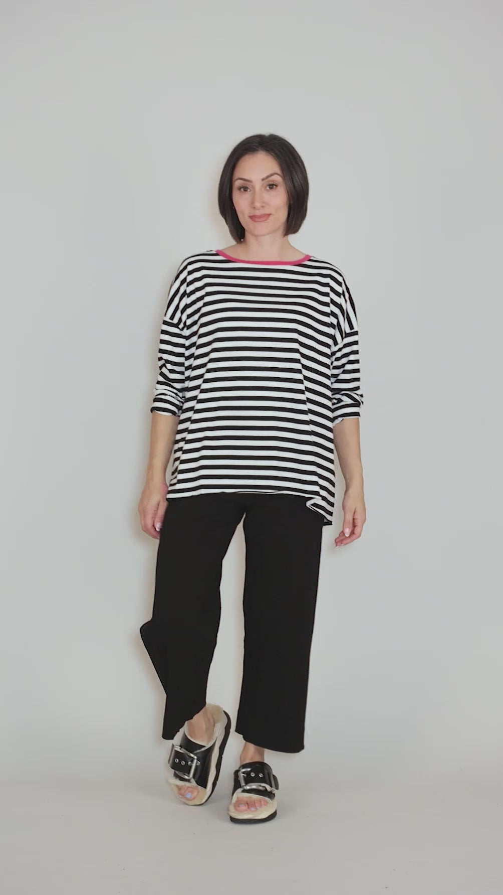 How cute is this T-shirt? Done in a smooth pima cotton, it has a contrasting crew neckline and a drop-shoulder construction. The boxy silhouette is oversized, hitting below the hips on most wearers.