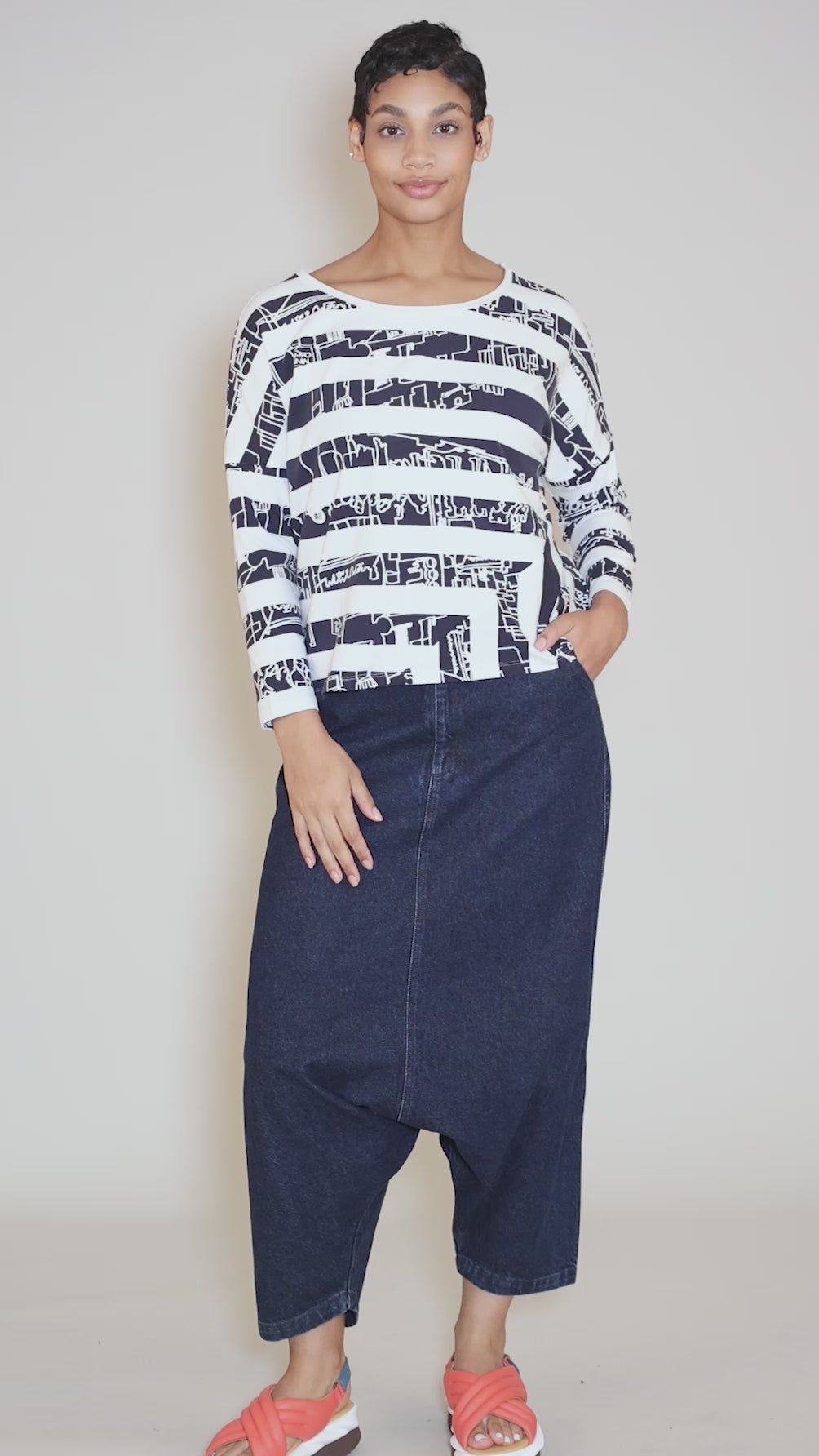 Made in a substantial cotton denim, the pants have a set-in waistband and a zipper-front placket; slit pockets sit on the hips. The rise is deeply extended for that European look. We find these are running generously, but not oversized.