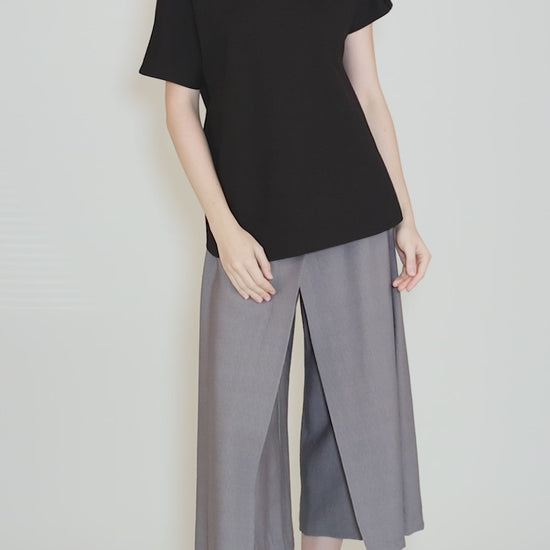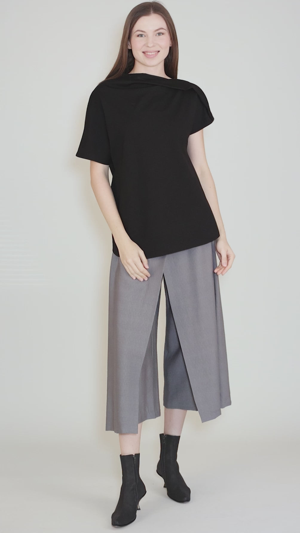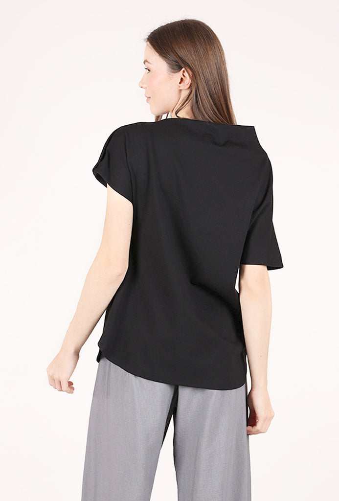 This chic top is made in a structured ponte knit with an off-center tuck detail on one shoulder and an asymmetric construction. The silhouette is fairly straight, ending in an uneven hemline. While it works perfectly well as a short-sleeve top, we also like it layered over warmer layers for the colder months. Please note that the sleeves are different lengths; we find it's running a bit on the large side.