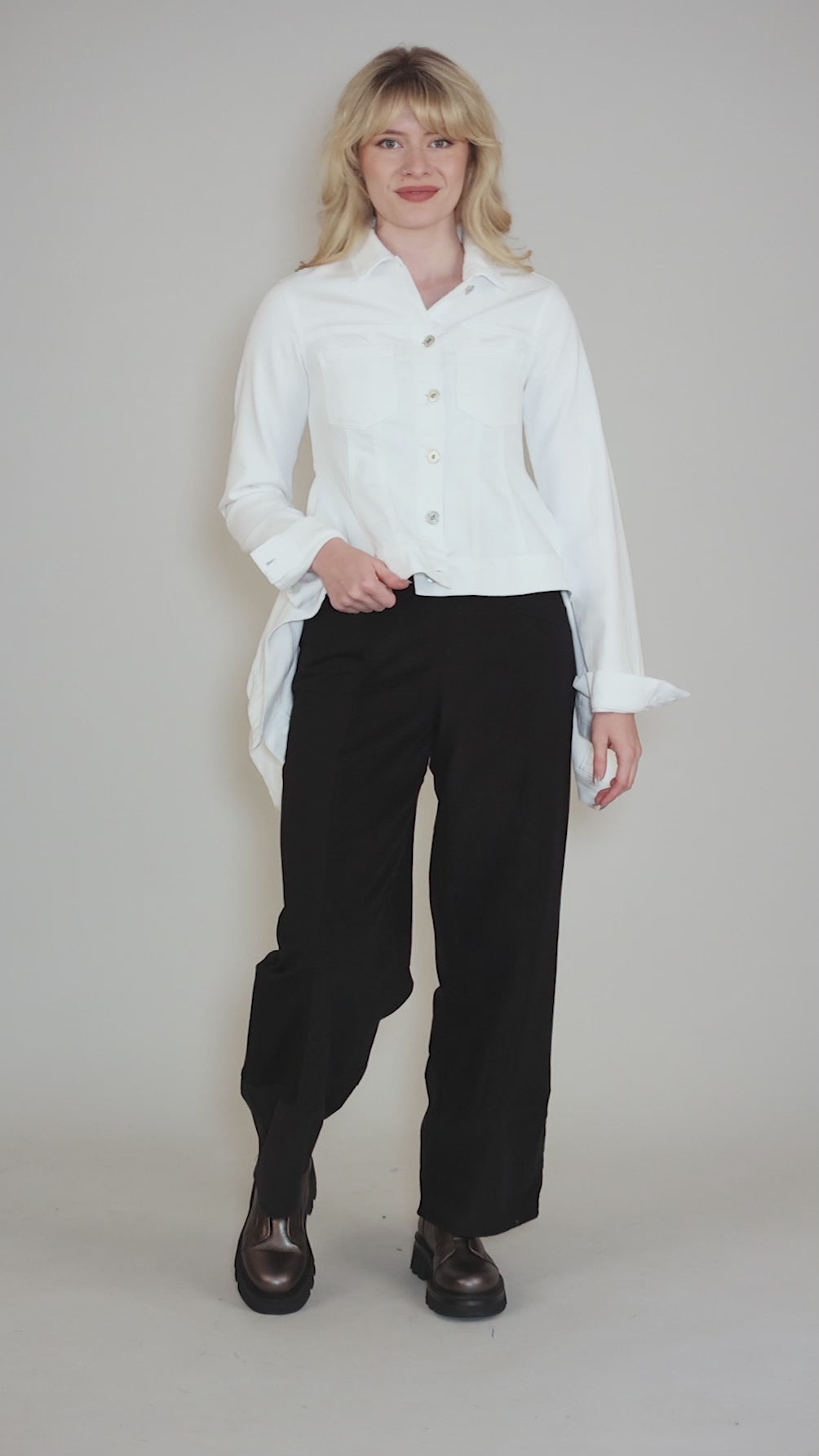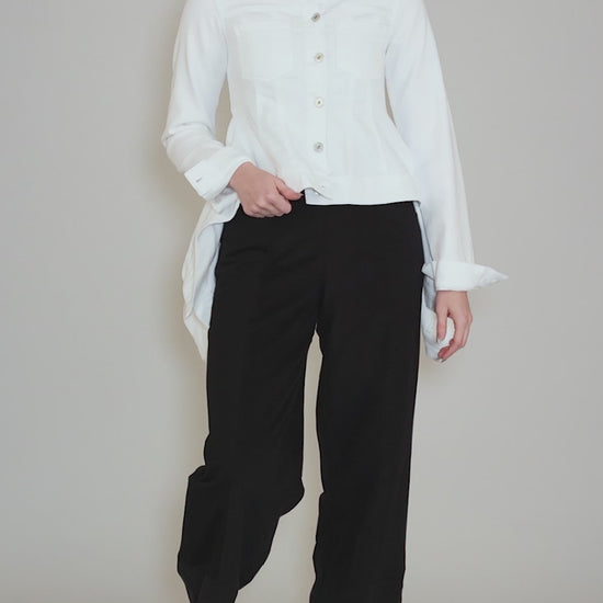 Easy Piece combines the structure of a jean jacket with the flourish of a tuxedo jacket! Made in a super-stretchy jersey knit, the jacket has a set-in shoulder, extra-long sleeves and a button-front placket. The dramatically high-low hemline is hip-skimming in front, while the swallowtail back fully covers the rear on most. This one can dress up or down with ease. Runs more true to size than many Pluslavie pieces.