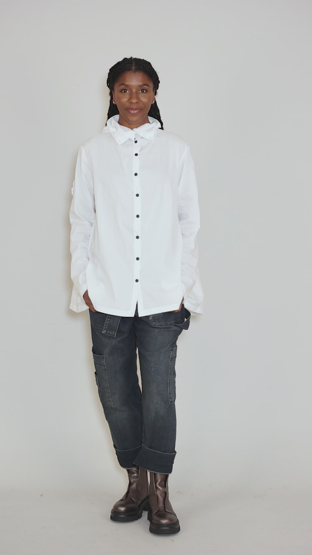 A hoodie blouse?! Pluslavie creates the mash-up with true elan. This little number has a button-front placket, with a high funnel neckline that sets the stage for a small hood in back. The silhouette is a full A-line, with a button-front placket and a set-in shoulder. In back, a seam across the shoulder blades sets up a shirred inset flourish. Pluslavie's signature removable button patch sits on one side. It's made in a fine cotton broadcloth blend.