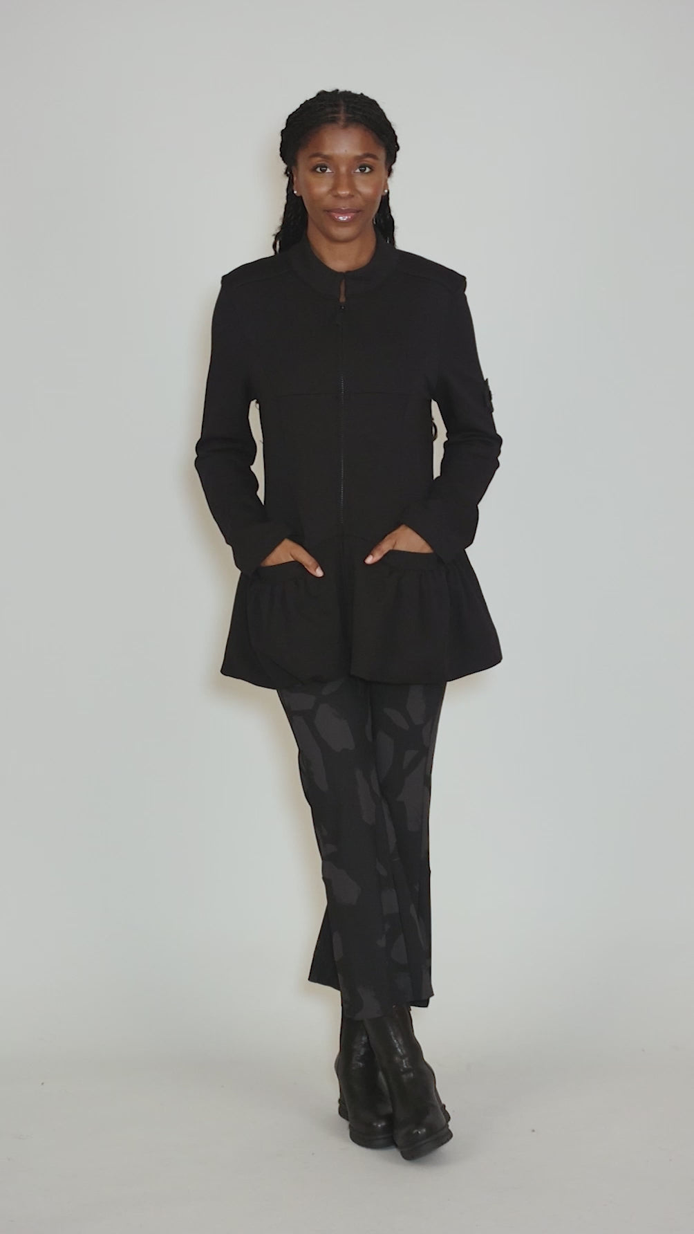 This sweet jacket is done in a mid-weight French terry knit, with a zipper-front placket, a set-in shoulder and long sleeves. The silhouette is elongated and slim-fitting through the body, then flares easily through the hips in a peplum finish. Shirred pouch pockets on the hips and an elastic gather at the low back add to the feminine vibe.