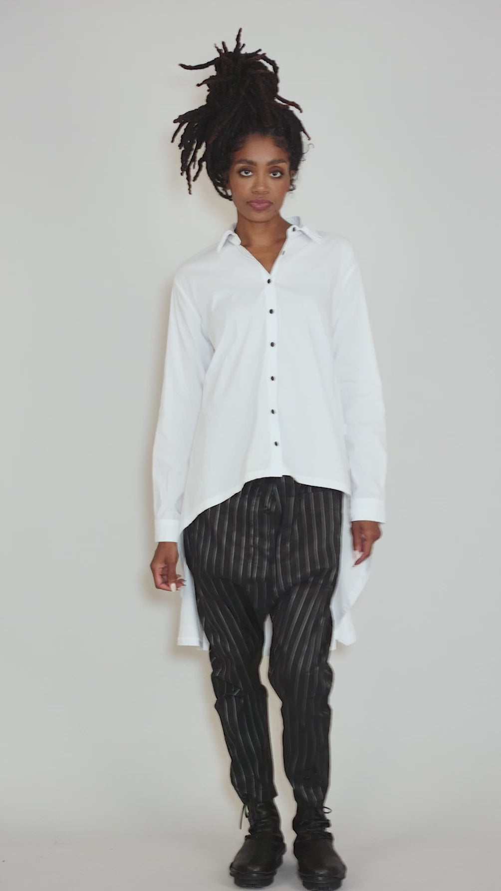Made in a fine cotton broadcloth blend, this easy shirt has a button-front placket, with a set-in shoulder and long sleeves. The body is a full A-line, with a dramatic high-low hemline. Two trailing ties allow for customized cinching in front or in back, and Pluslavie's signature removable button patch sits on one side. The shirt collar is triple-layered for added fun.