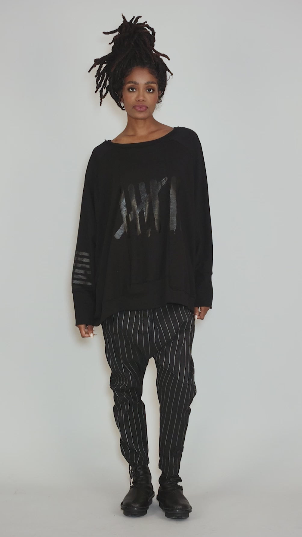 Made in a soft sweatshirt fleece, this oversized piece has a wide boat neckline, a drop-shoulder construction and very deep dolman sleeves. Ribbed details in back and at the end of the extra-long sleeves add those special Pluslavie touches, along with the brand's signature plus-sign embellishment. We find this is running quite large.