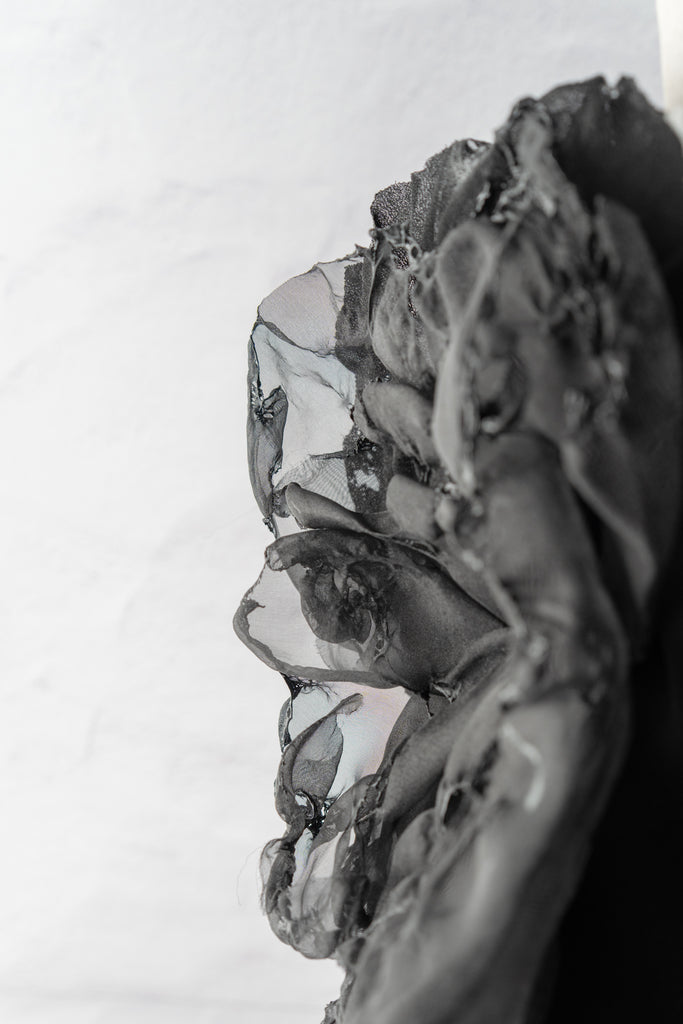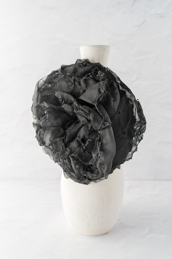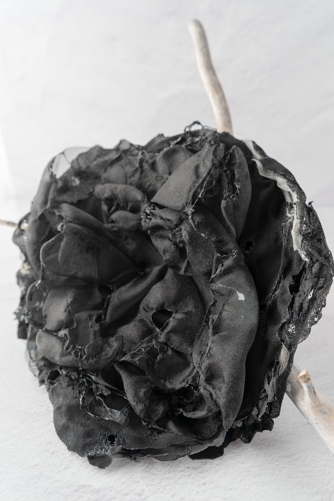 A darkly romantic take on the classic corsage, the Sanctamuerte Posey Pin channels the brand’s retro avant-garde aesthetic through texture and decay. Handcrafted in Italy from layered black textiles, this distressed “flower” pin reveals intricate burn details and raw, frayed edges that lend a sculptural, time-worn beauty. Its imperfect petals suggest both elegance and erosion, an accessory that transforms imperfection into beautiful art.