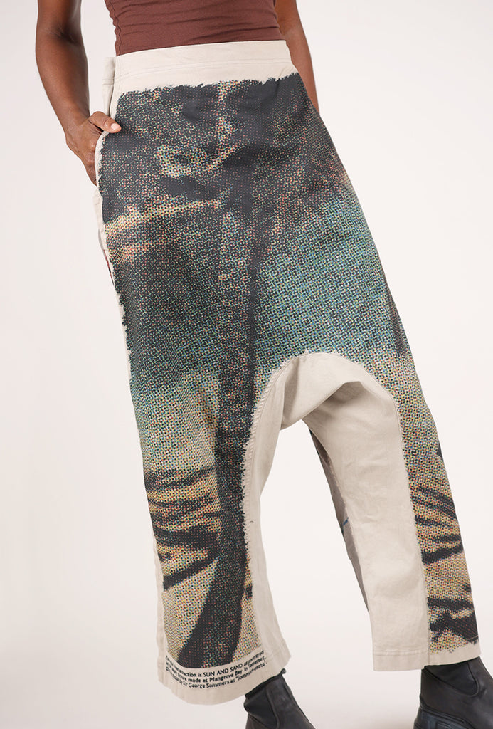 We love the fabric here, a midweight woven cotton blend with innate stretch and structure. The pants have a self waistband, with an extended rise and a wider legs. Slit pockets sit on the hips. The print here is delightful, a vacation postcard in front, complete with a message and address on the back.