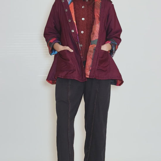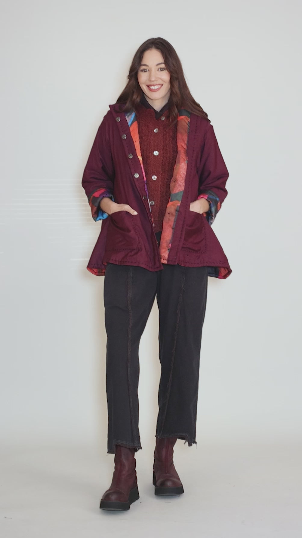 This little topper is SO lightweight and soft, but still offers cozy warmth. The cotton blend fabric on top has a subtle sheen, with a duvet-like hand and discreet quilted accents throughout. The silhouette is a very full A-line, with hip pockets and a front snap placket. The lining is rather glorious, a contrasting silky viscose in shades of orange and teal.