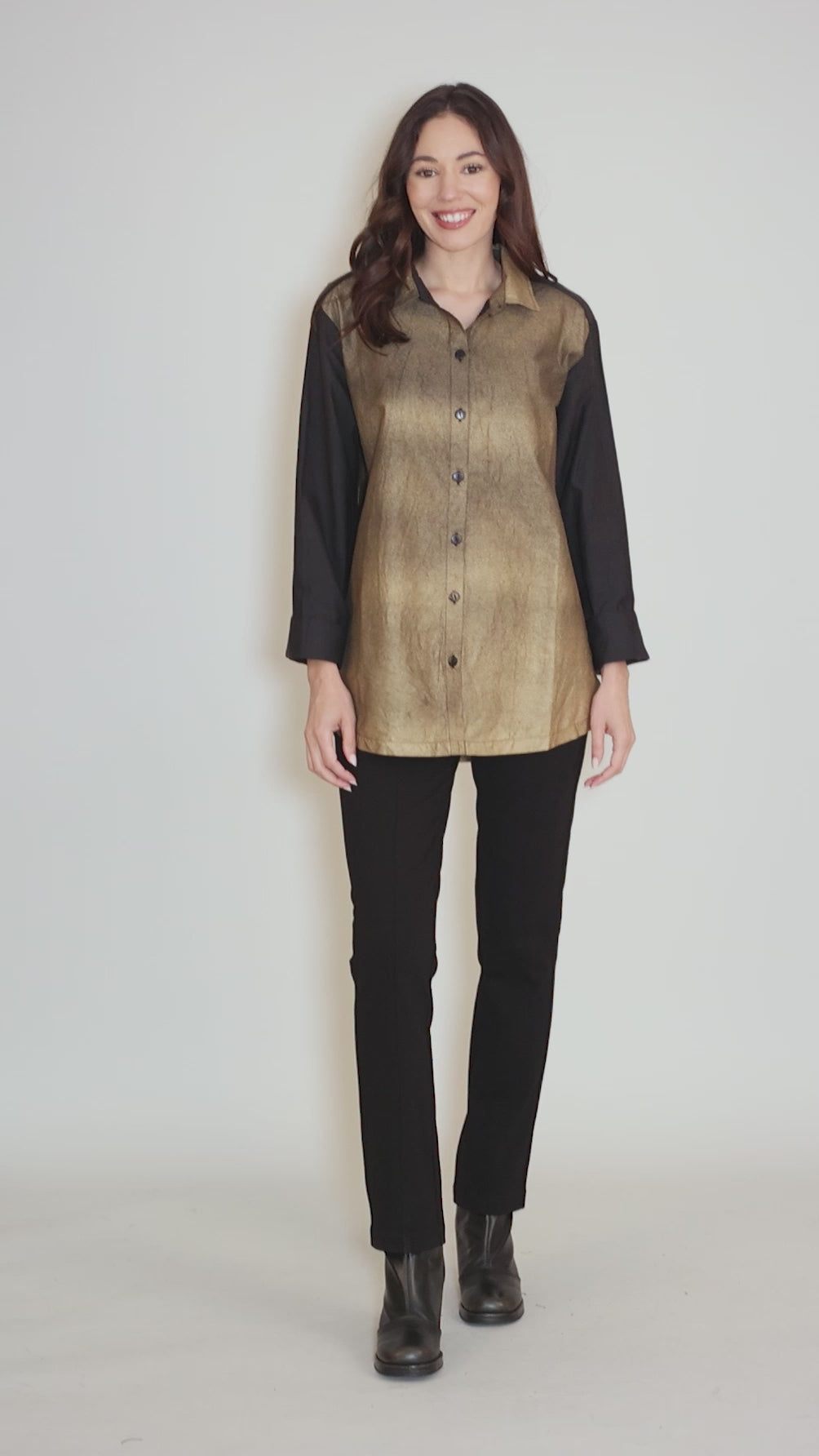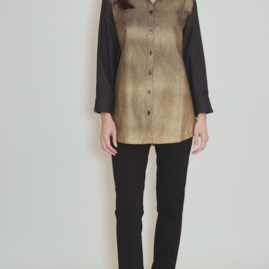 This tailored — yet still relaxed! — shirt has a set-in shoulder, a button-front placket and a trim silhouette. The body has been hand-painted in a striking gold foil, adding a dressy element to the classic button-down styling.