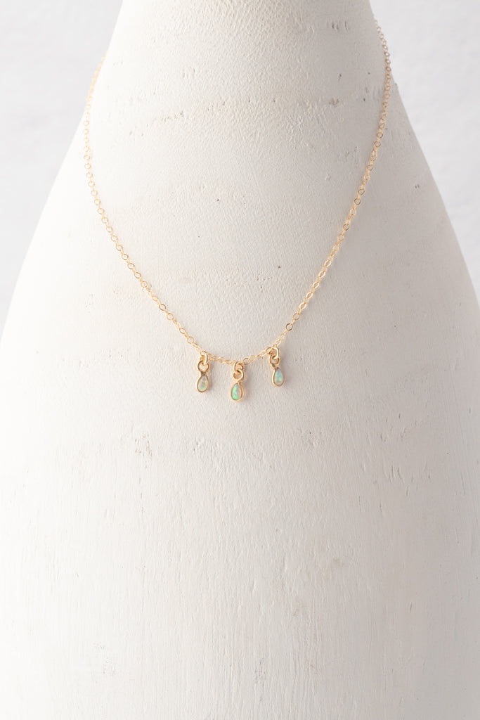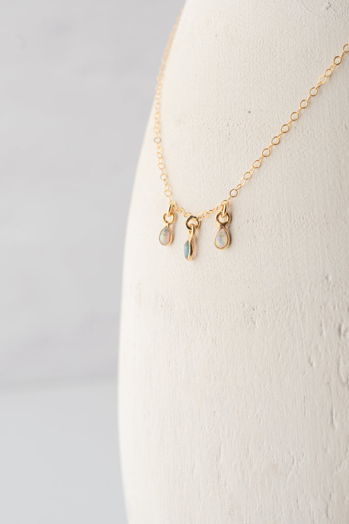 A delicate trio of tiny white opal doublets, each set in a polished gold bezel, floats along a 14K gold-filled chain. This dainty, sparkly piece is designed for everyday wear and effortless layering, bringing a soft glow and a touch of magic to any neckline.