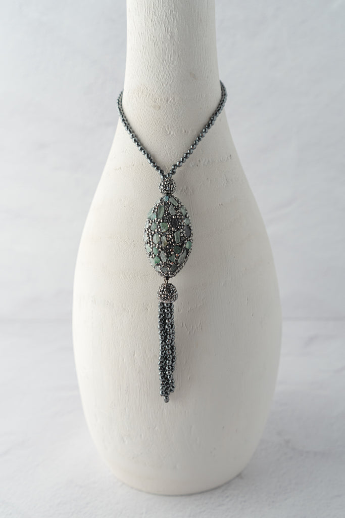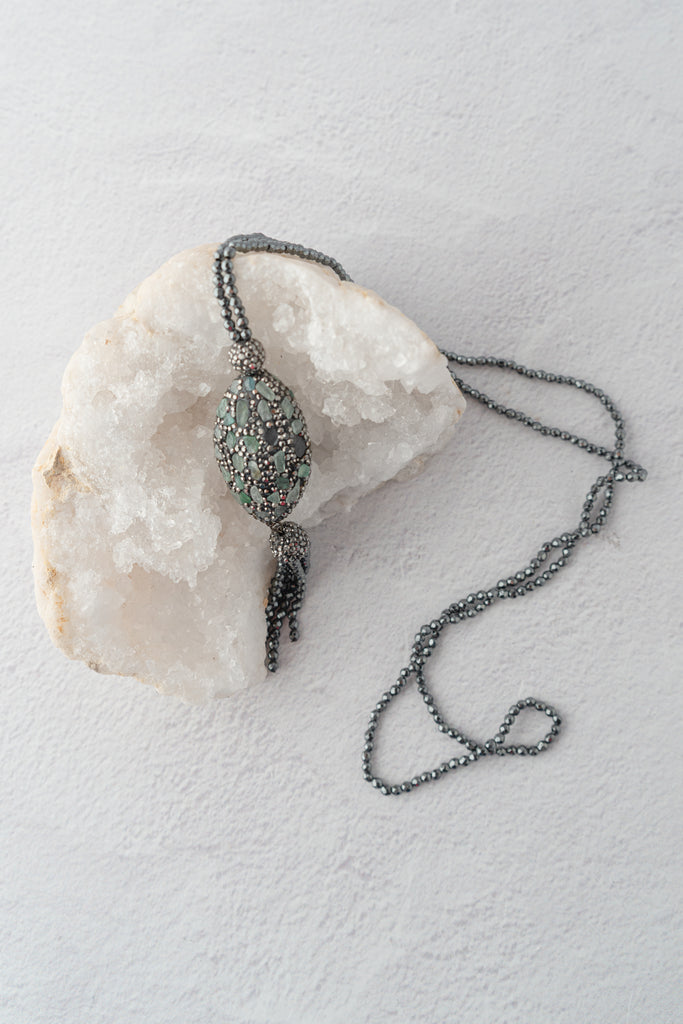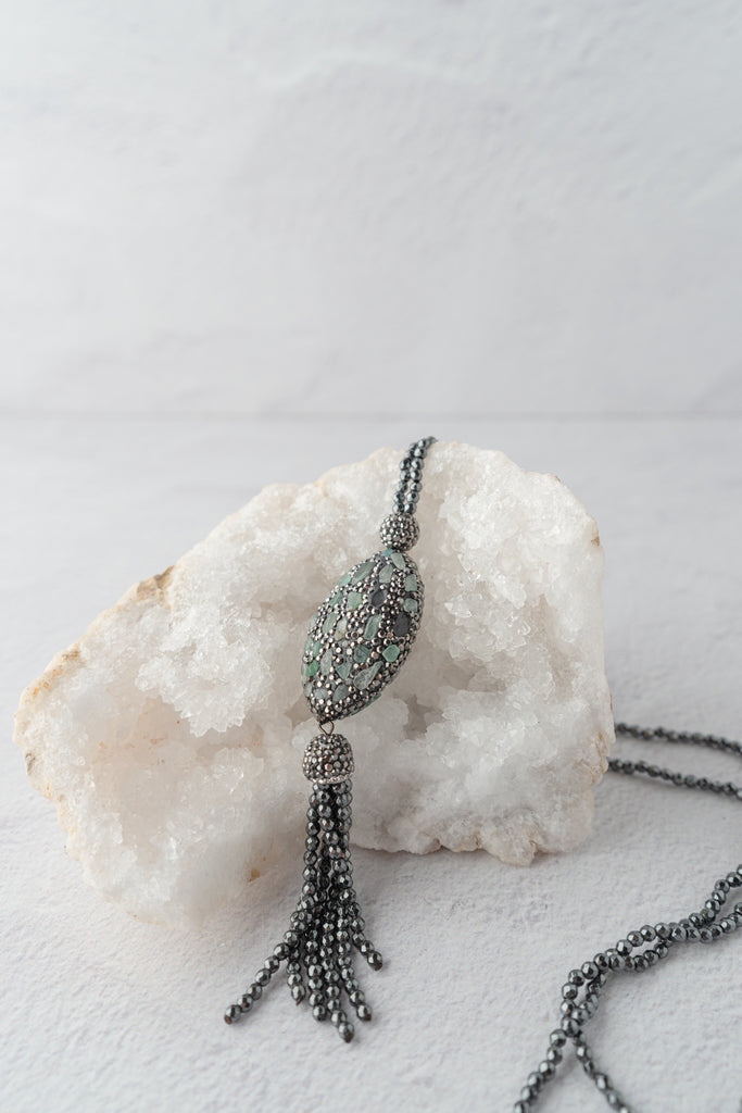 An artful statement piece featuring a mosaic pendant of soft green and gray stones framed by metallic beading. The long faceted chain and shimmering tassel drop add elegant movement and texture, creating a look that’s both bohemian and refined.