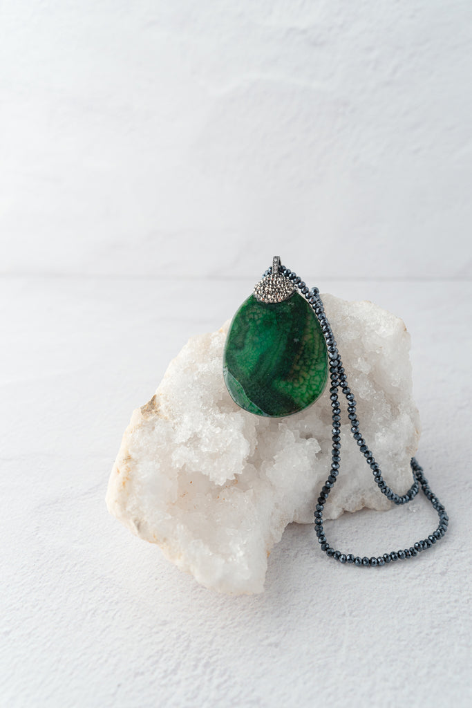 A bold statement piece featuring a faceted green pendant framed with shimmering pavé accents. The pendant hangs from a strand of dark, faceted metallic beads, adding a sleek contrast that enhances its natural depth and texture.