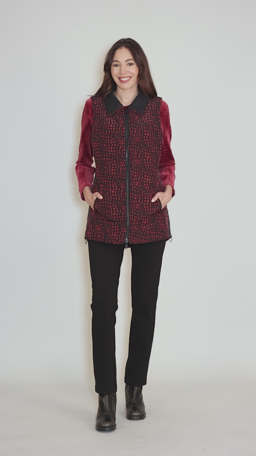 This reversible vest topper is black on one side with red accents and a red and black print on the other. It's done in a sleek nylon, lightly padded for warmth, with a zip closure in front and hip pockets on both sides. The fit is tailored, but not restrictive.