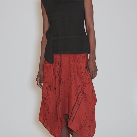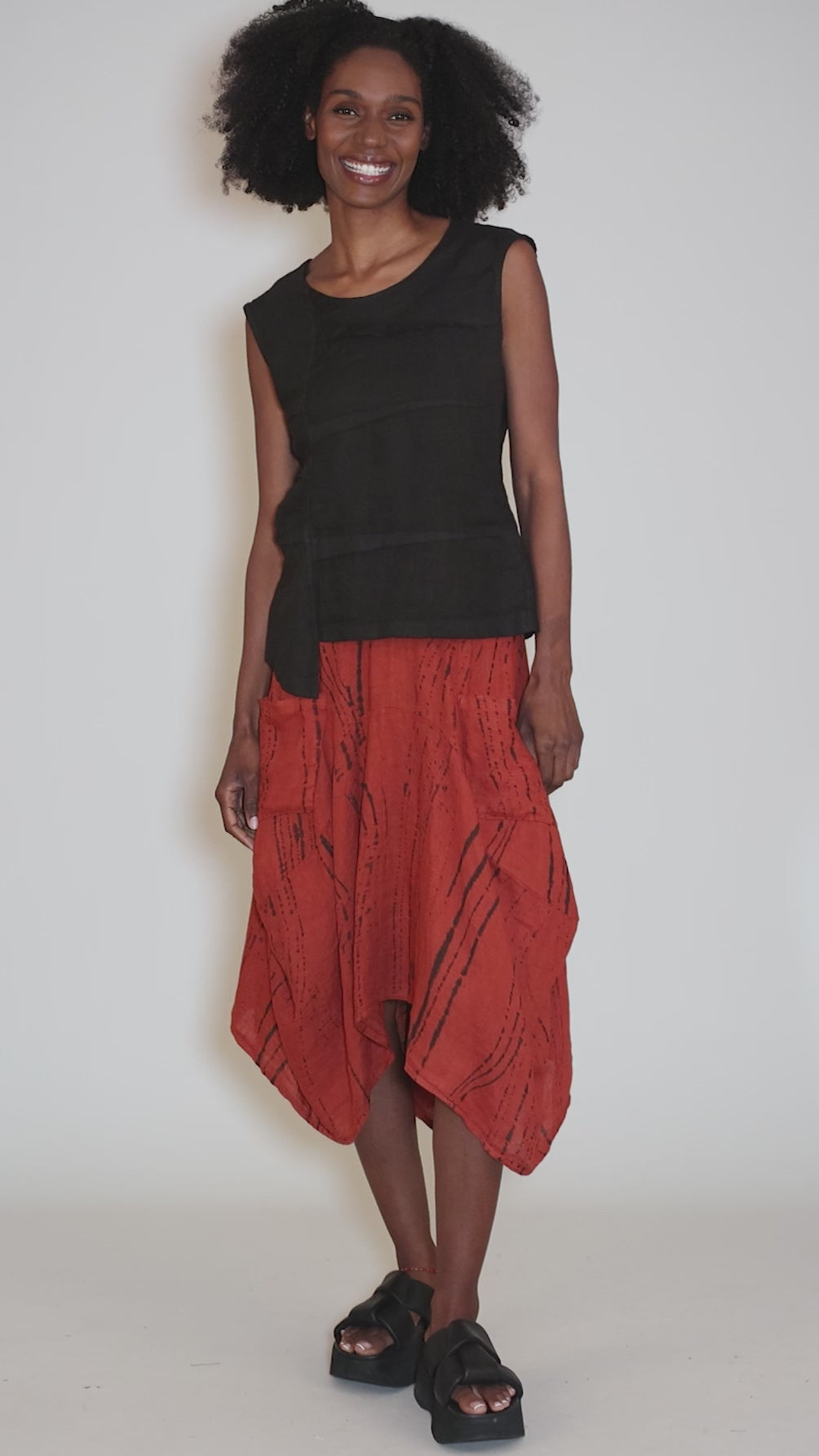 This is such a good tank! It's done in a soft linen in front and a ribbed jersey knit in back. Asymmetrical pleat details sit in front, and the uneven hemline adds to the off-kilter appeal. We find this is running on the small side.