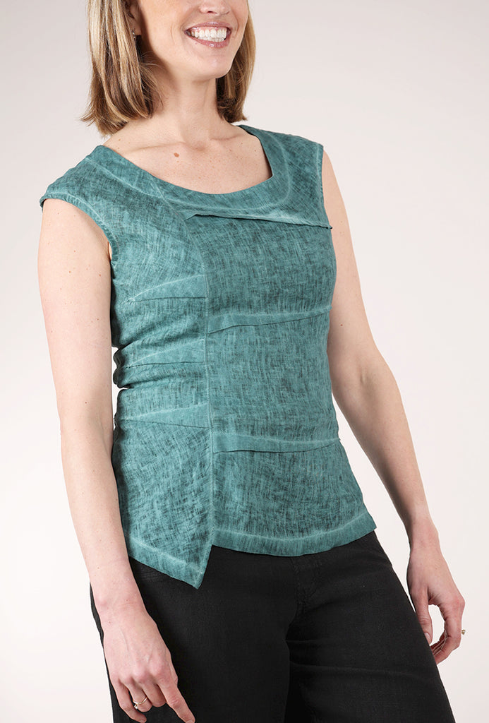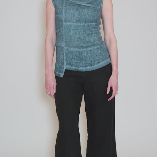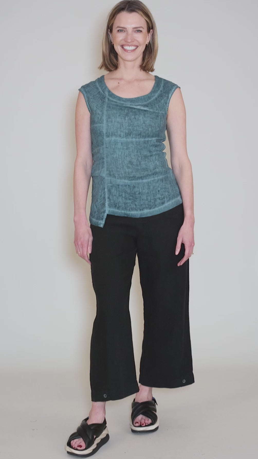 This is such a good tank! It's done in a soft linen in front and a ribbed jersey knit in back. Asymmetrical pleat details sit in front, and the uneven hemline adds to the off-kilter appeal. We find this is running on the small side.