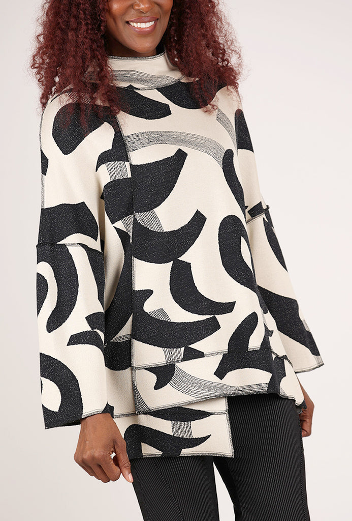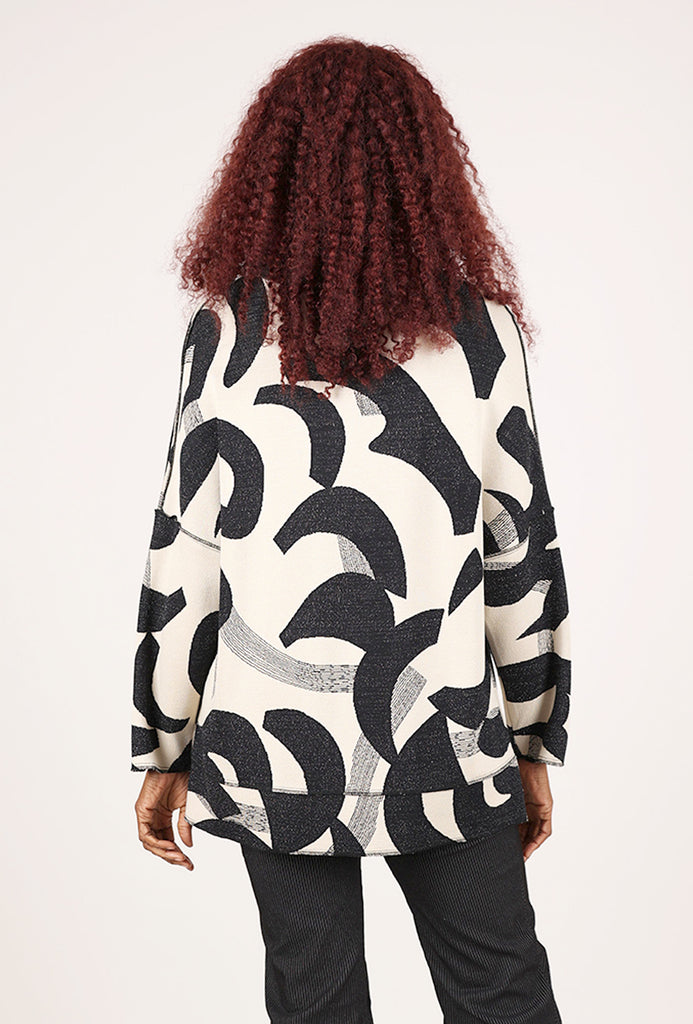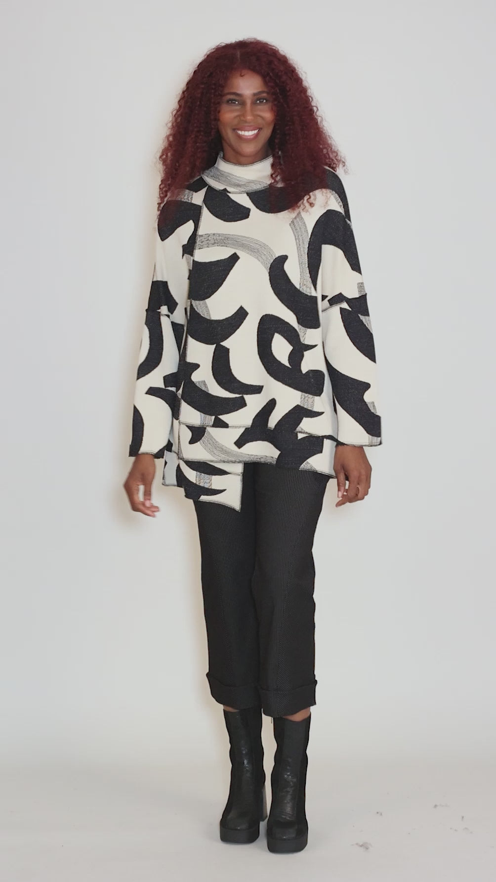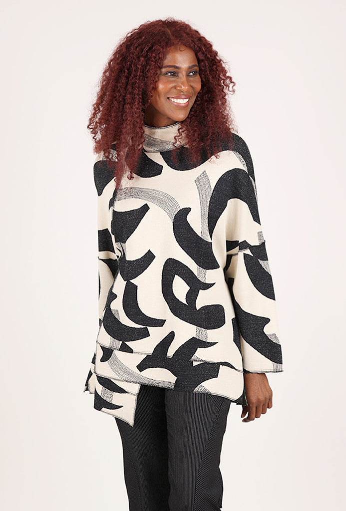 Made in a softly knit poly-viscose blend with excellent drape, Rima has a funnel neckline, with a drop-shoulder construction and a full, A-line silhouette. The hemline is stepped and uneven, adding further ease through the hips. Running on the large side.