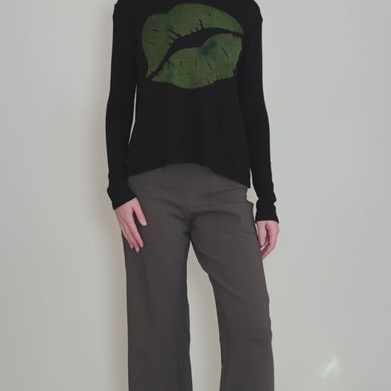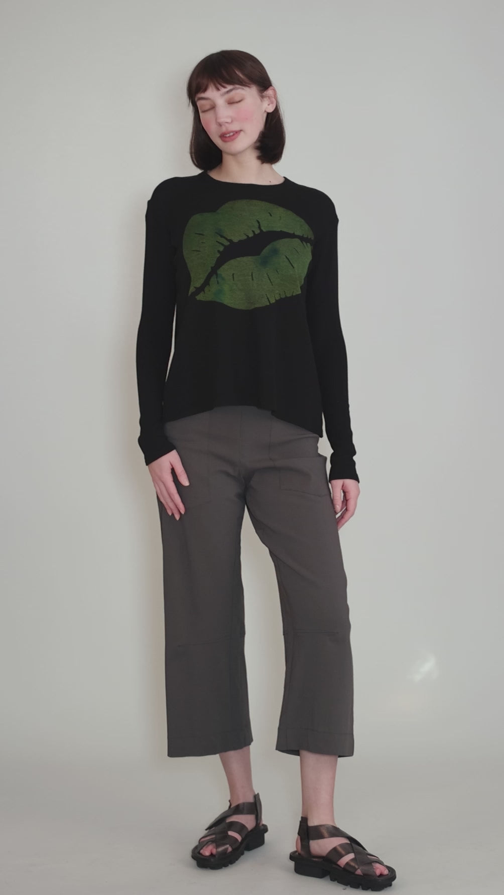 A cropped barrel leg in Porto's fabulously stretchy twill, these best-selling pants have a flat waistband (with inside "grippers" to keep the pants from sliding down!) and wide legs that arch to just above the ankle. The fit is slim through the hips, but quite easy through the legs. Many of our in-store customers have opted to size down in this style.
