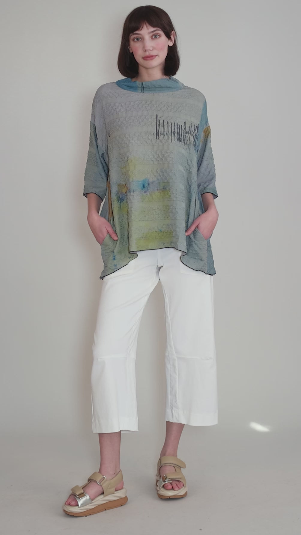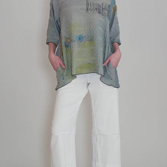 A cropped barrel leg in Porto's fabulously stretchy twill, these best-selling pants have a flat waistband (with inside "grippers" to keep the pants from sliding down!) and wide legs that arch to just above the ankle. The fit is slim through the hips, but quite easy through the legs. Many of our in-store customers have opted to size down in this style.