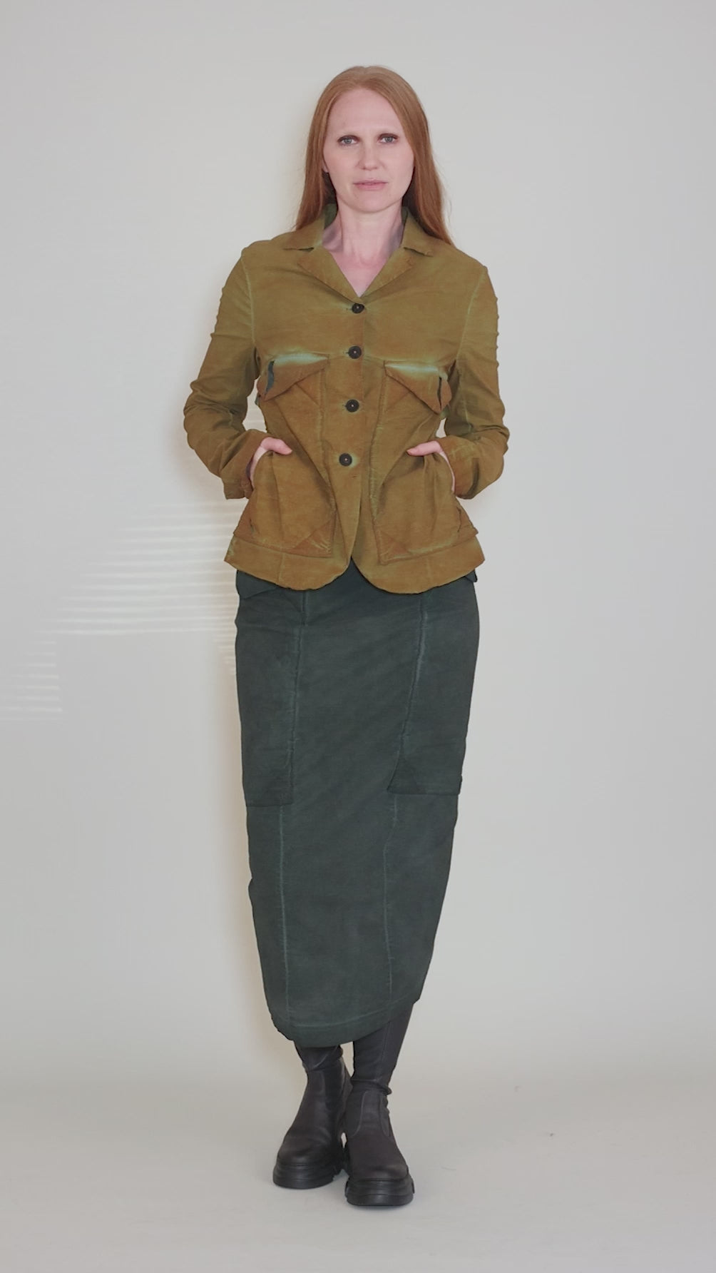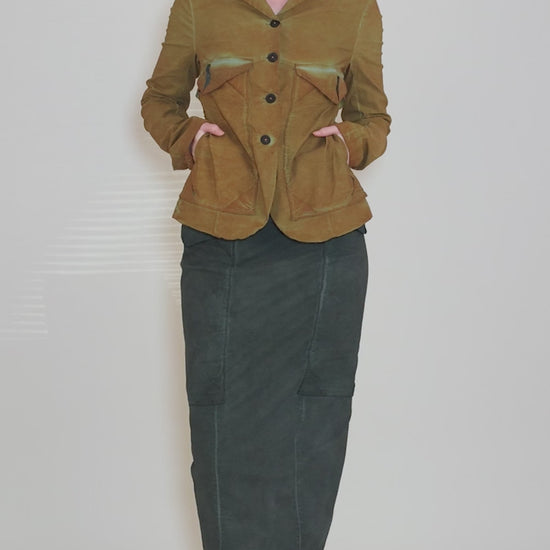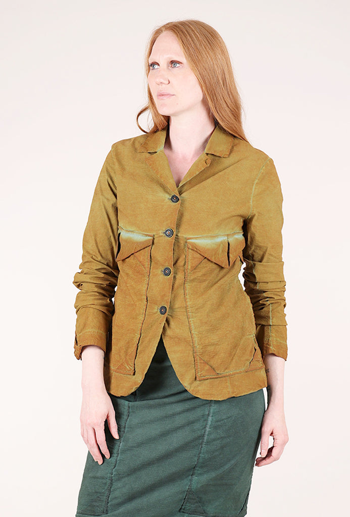 How gorgeous is this hand-painted jacket? It's made in a truly fantastic fabric, a lightweight, woven viscose blend with a crisp hand and excellent stretch. The jacket has a classic silhouette, with a button-front placket, a small lapel and extra-long sleeves. Deep patch pockets sit on the chest and an inverted pleat sits at the low back. Running true to size to slightly small.