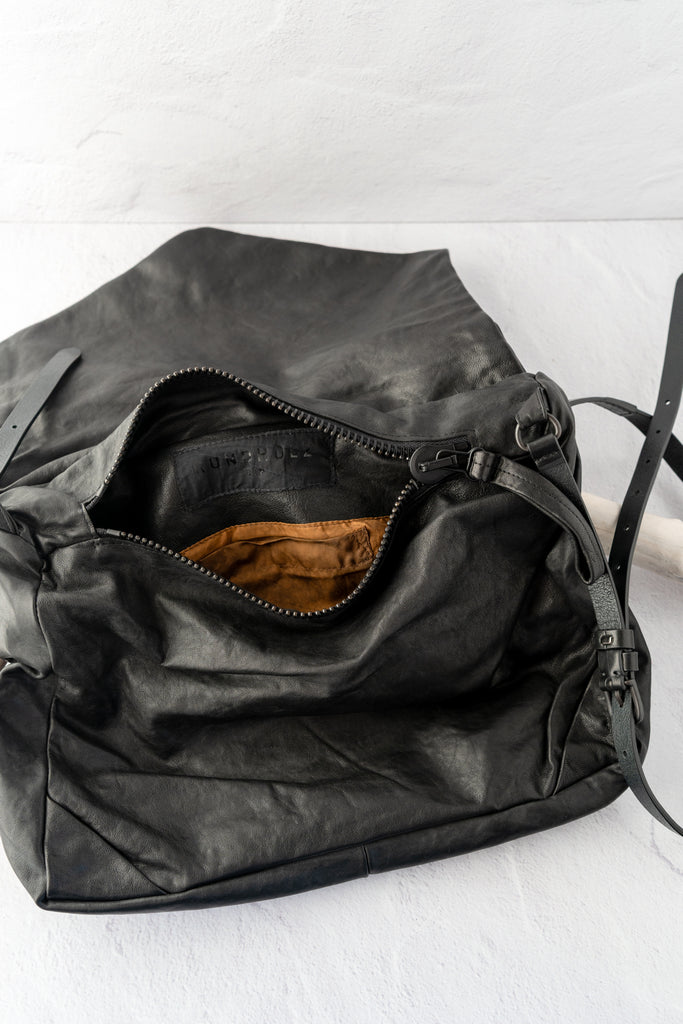A study in relaxed elegance, the Rundholz Covet Bag in black leather pairs soft structure with effortless attitude. Crafted from supple leather, it molds to your lifestyle, roomy yet graceful, bold yet understated. A wide flap folds over the front, concealing a practical zip-entry and an inner compartment lined in contrasting soft brown tones. Slim straps and clean hardware accents let the leather speak for itself.
