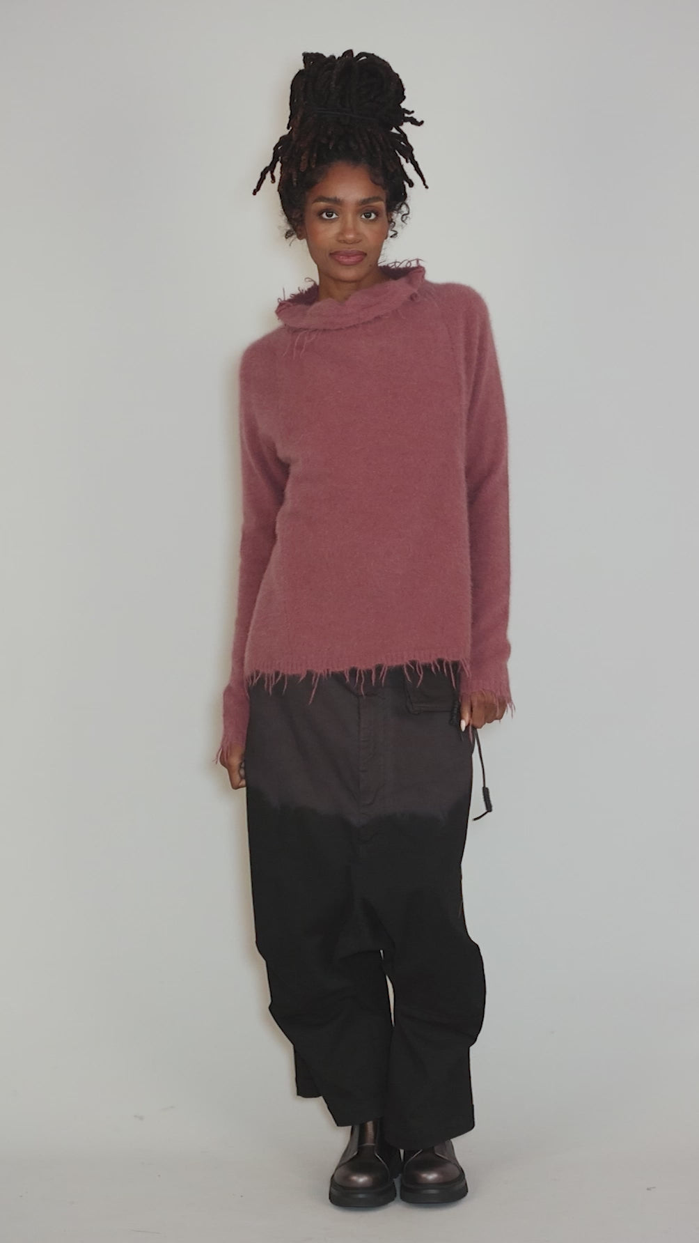 How beautiful is this color? Crafted in a sumptuous blend of wool, silk and fox hair, this luxurious pullover has a short funnel neckline, extra-long sleeves and a fairly trim, slightly elongated silhouette. The hemlines all boast a fringed finished, adding extra dimension to the look.