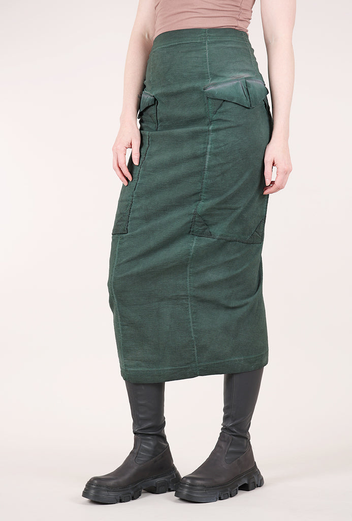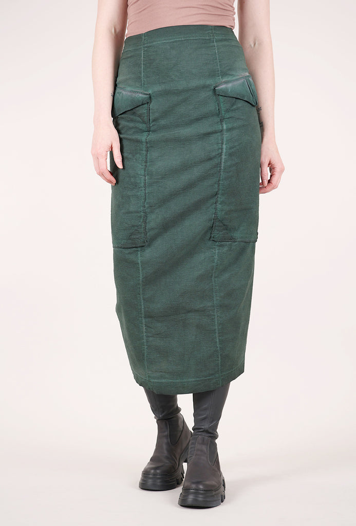 This go-to, hand-painted skirt is made in a truly fantastic fabric, a lightweight, woven viscose blend with a crisp hand and excellent stretch. It has a flat stretch waistband, with a columnar silhouette and deep patch pockets in front. Running true to size.