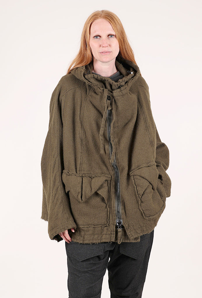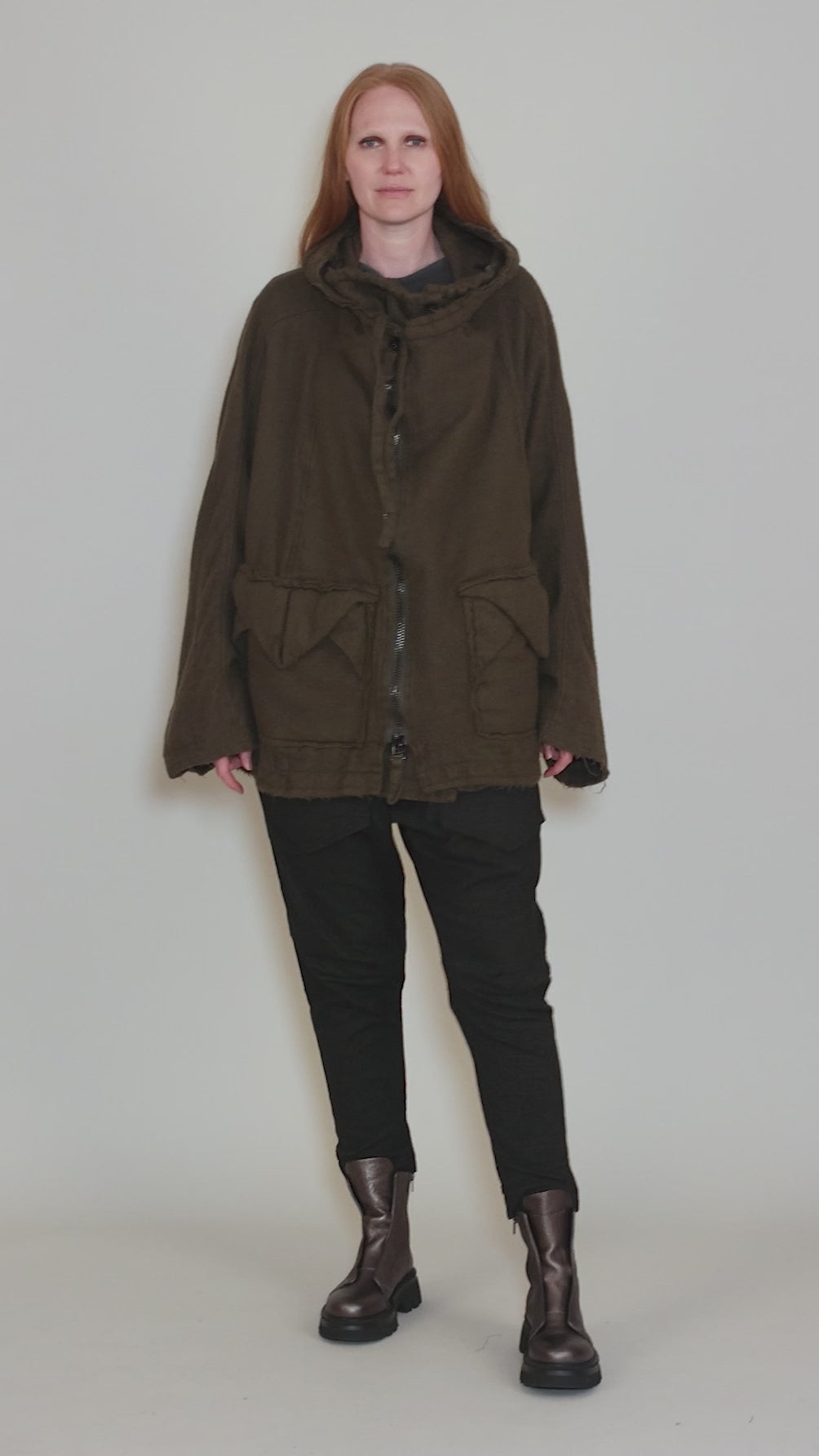 This fabulous hooded coat checks all the boxes in the classic Rundholz style guide. It's made in a mid-weight boiled wool, with a very full, cocoon-shaped silhouette. The sleeves are full and extra-long, with a front zipper closure and oversized patch pockets on the hips. We find this is running quite large.