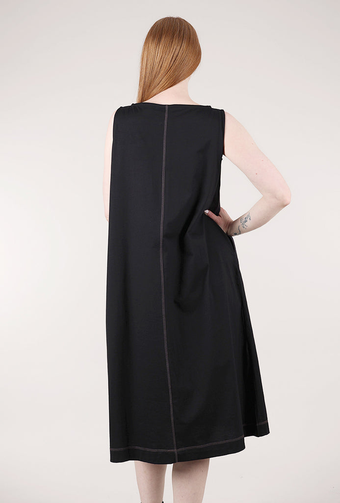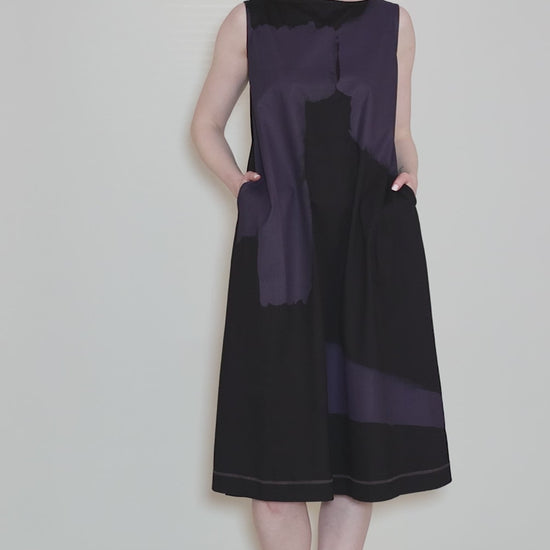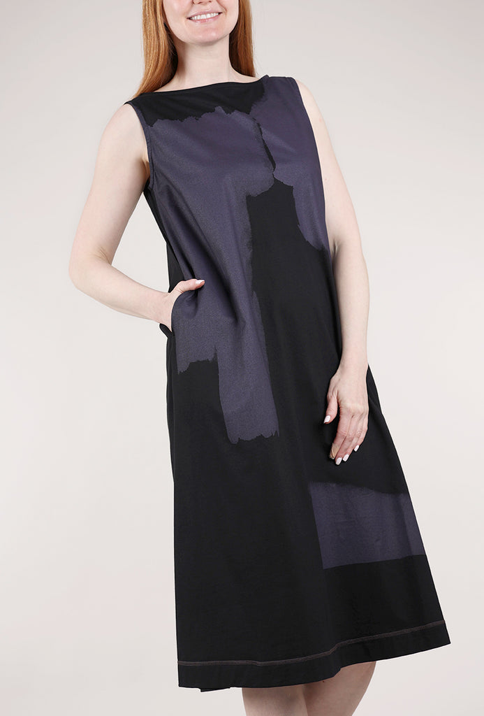 So easy! Done in a luxe, mid-weight cotton knit jersey, this sweet piece has a boat neckline and a full, A-line silhouette. Slit pockets are hidden on the side seams. A scribble graphic repeats through the piece. Running quite generously, like most Moyuru styles.