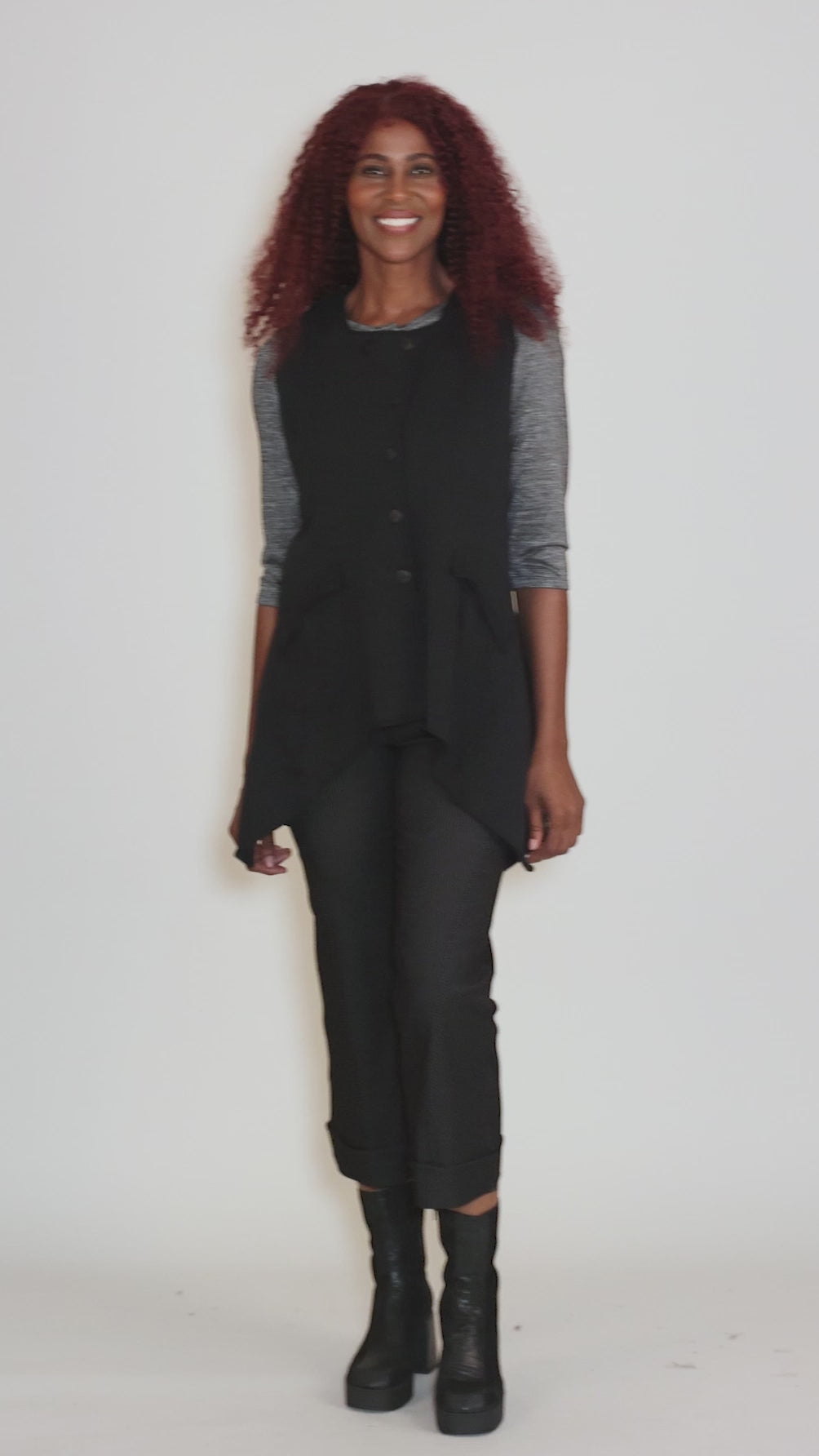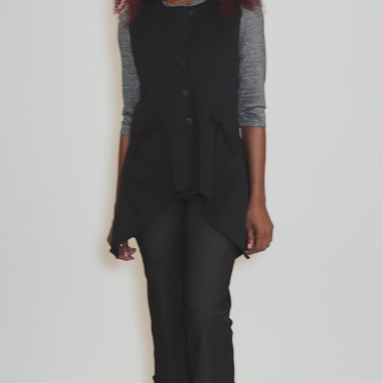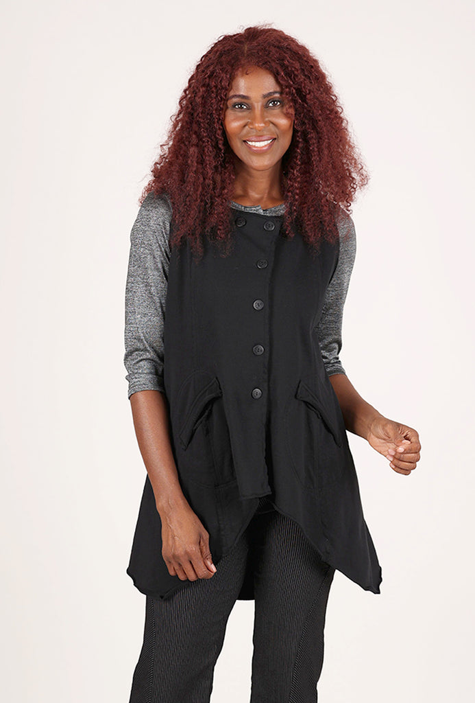 Made in a rather mid-weight sweatshirt knit, this essential third layer has a button-front placket and a full, A-line silhouette. An oversized hood and patch pockets on the hips add to the layering fun. Running on the large side.