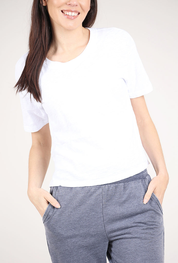 Made in a lightweight cotton slub T-shirt knit, this trim crewneck tee has short sleeves and a fresh, shorter hip-skimming length. Running true to size.