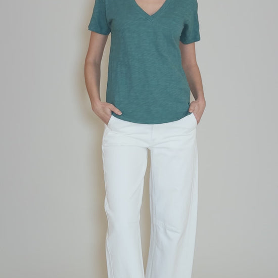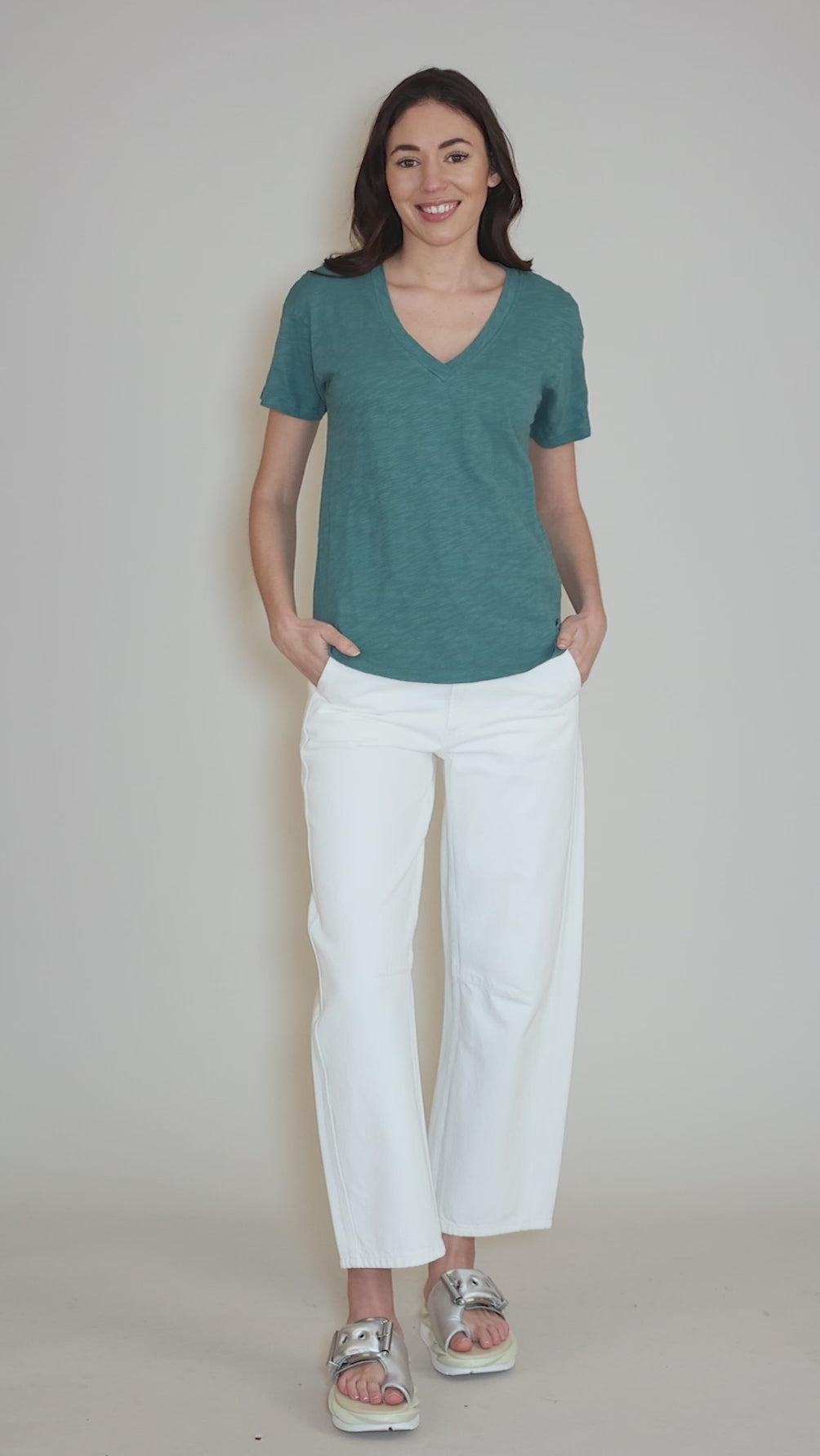 Made in a lightweight cotton slub T-shirt knit, this relaxed V-neckline tee has short sleeves and a hip-skimming length. Running true to size.