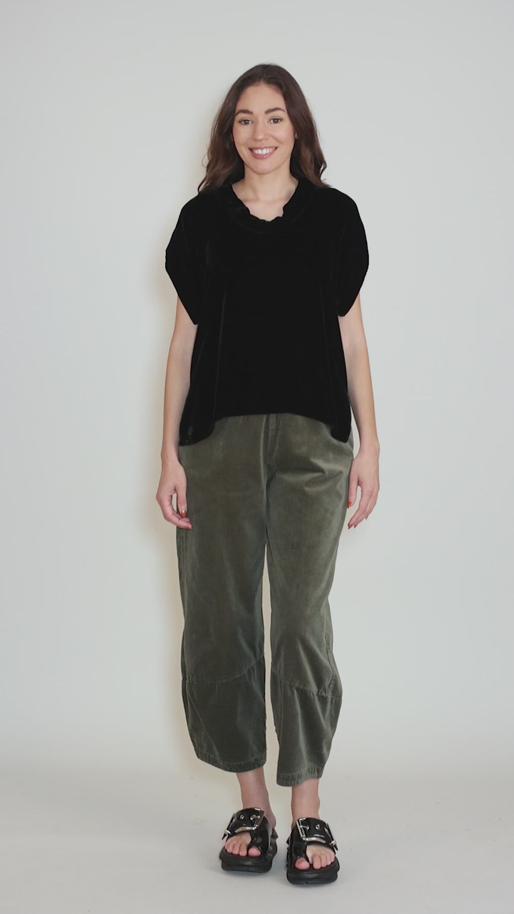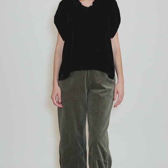 One of our best-selling Cut Loose summer tops, now imagined in velvet! This pretty top has a cowl neckline, short sleeves and a deliberately boxy shape. Its hip-skimming length makes it an ideal partner to higher-waisted bottoms.