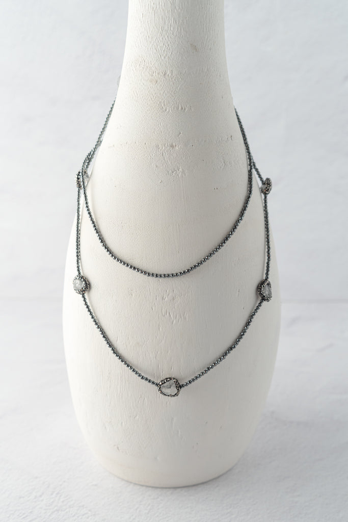 A modern layering piece featuring faceted hematite beads and shimmering crystal-accented open circles spaced along the strand. Its subtle sparkle and versatile design make it easy to pair with both casual and dressy looks.