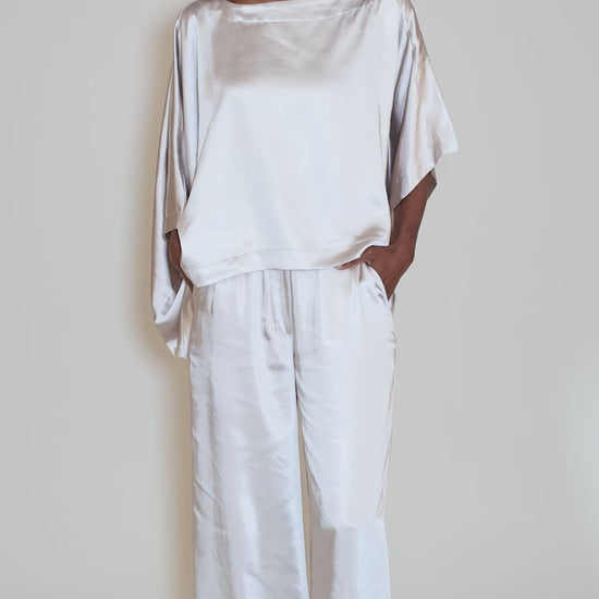 This versatile top is done in a substantial sateen fabric, with a wide neckline (it can be worn off the shoulder OR not) and a drop-shoulder construction. The body is deliberately boxy, with a high-low hemline. It can dress up or down with ease -- as chic with denim as it is with its matching pant!