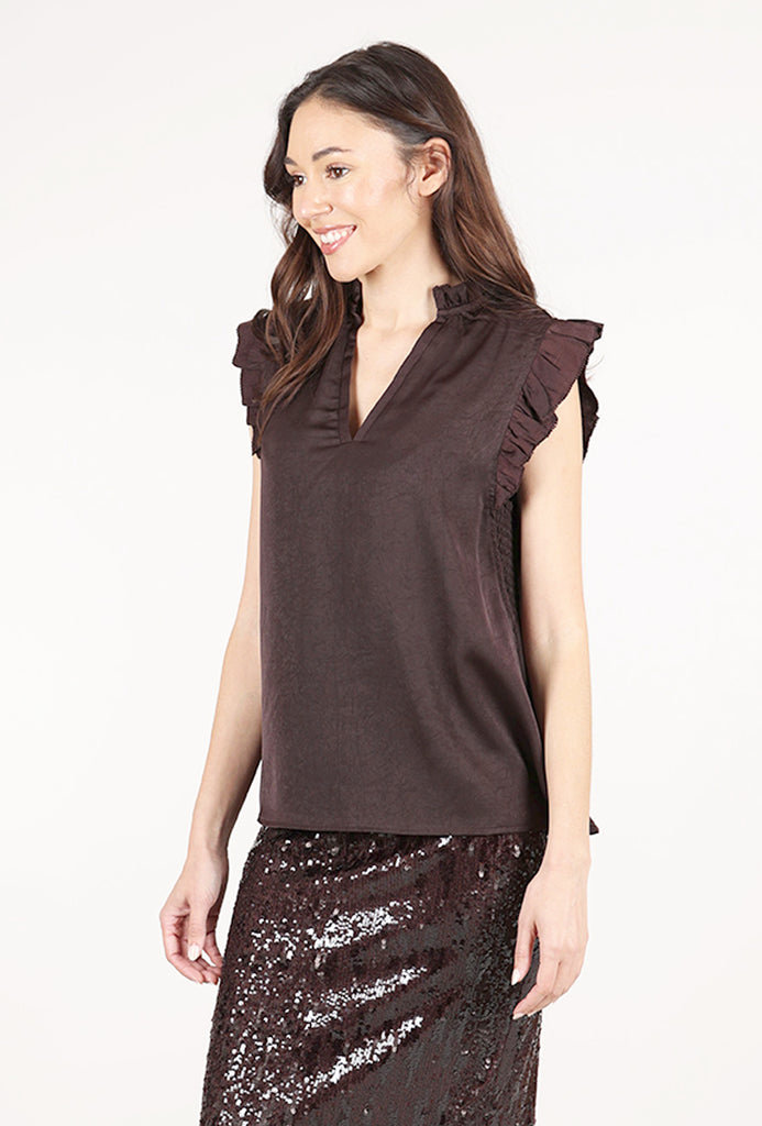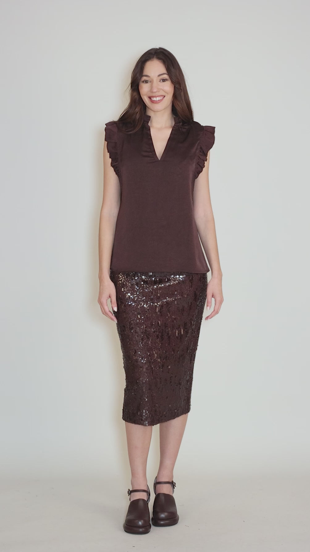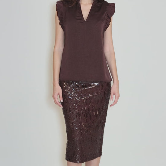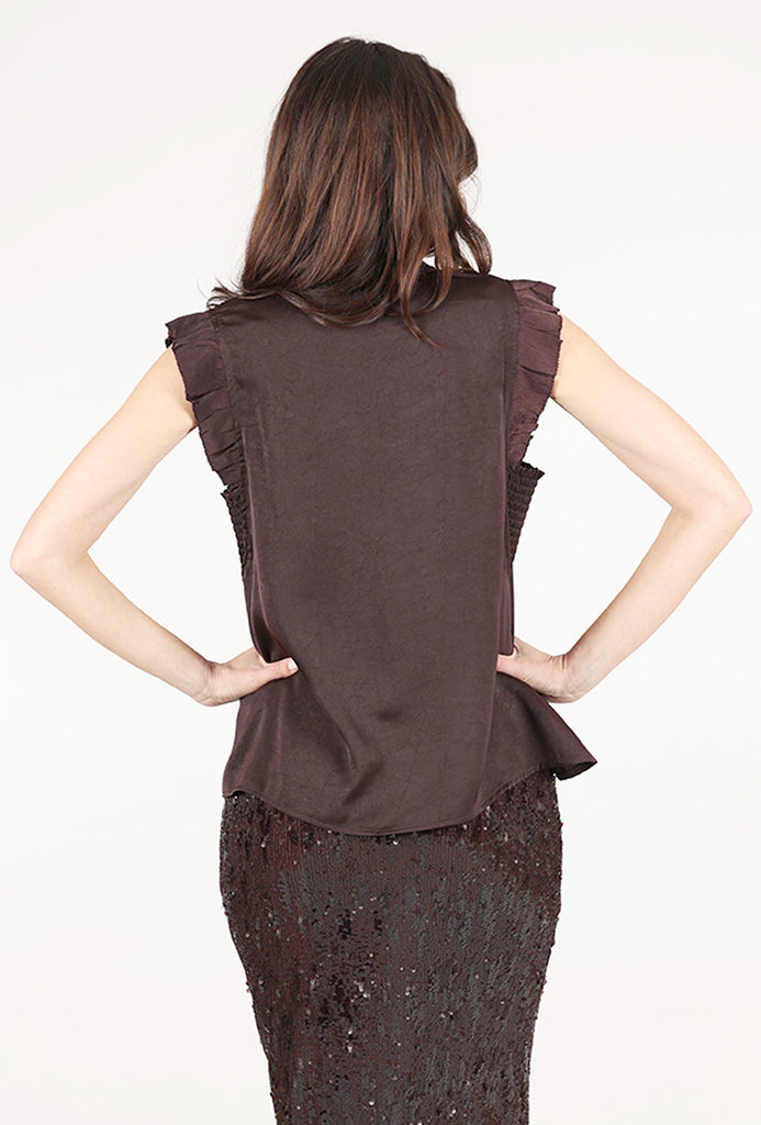Done in a rich-looking sateen, this feminine top has a V neckline and fluttery cap sleeves; the blouse brushes the top of the hip. The effect is tailored, but the fit is relaxed.