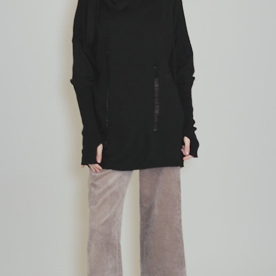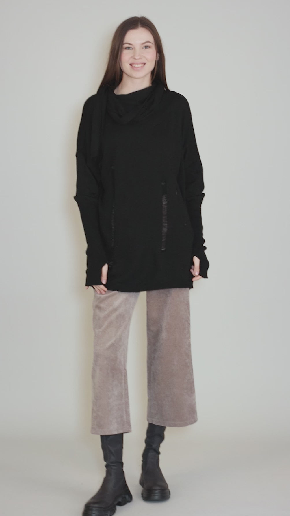 Crafted in a mid-weight knit blend, this deliberately tattered sweater has extra-long sleeves and an oversized, slouchy fit; dimensional seaming; dropped stitches and raw edges create an edgy vibe. The attached scarf winds easily around the neck. The fit here is quite relaxed; for a more tailored effect, we recommend sizing down.