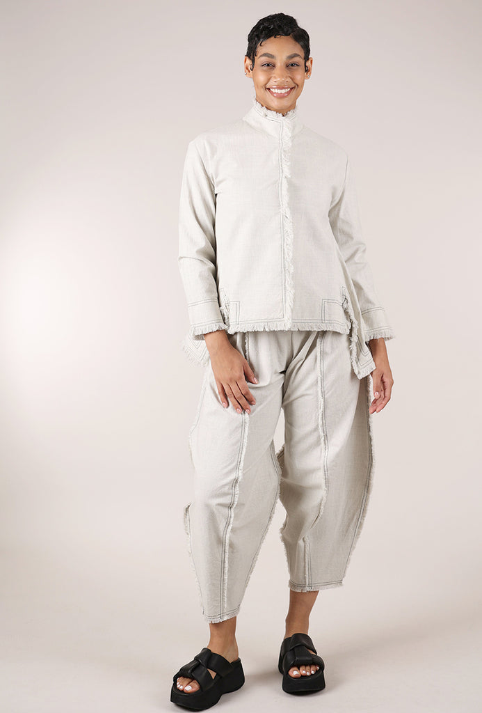 Made in a fine cotton lawn, these easy pants have a flat elastic waistband, with full, lantern-shaped legs and contrast-stitch details throughout. Frayed seam edges add to the artisan vibe of the look.
