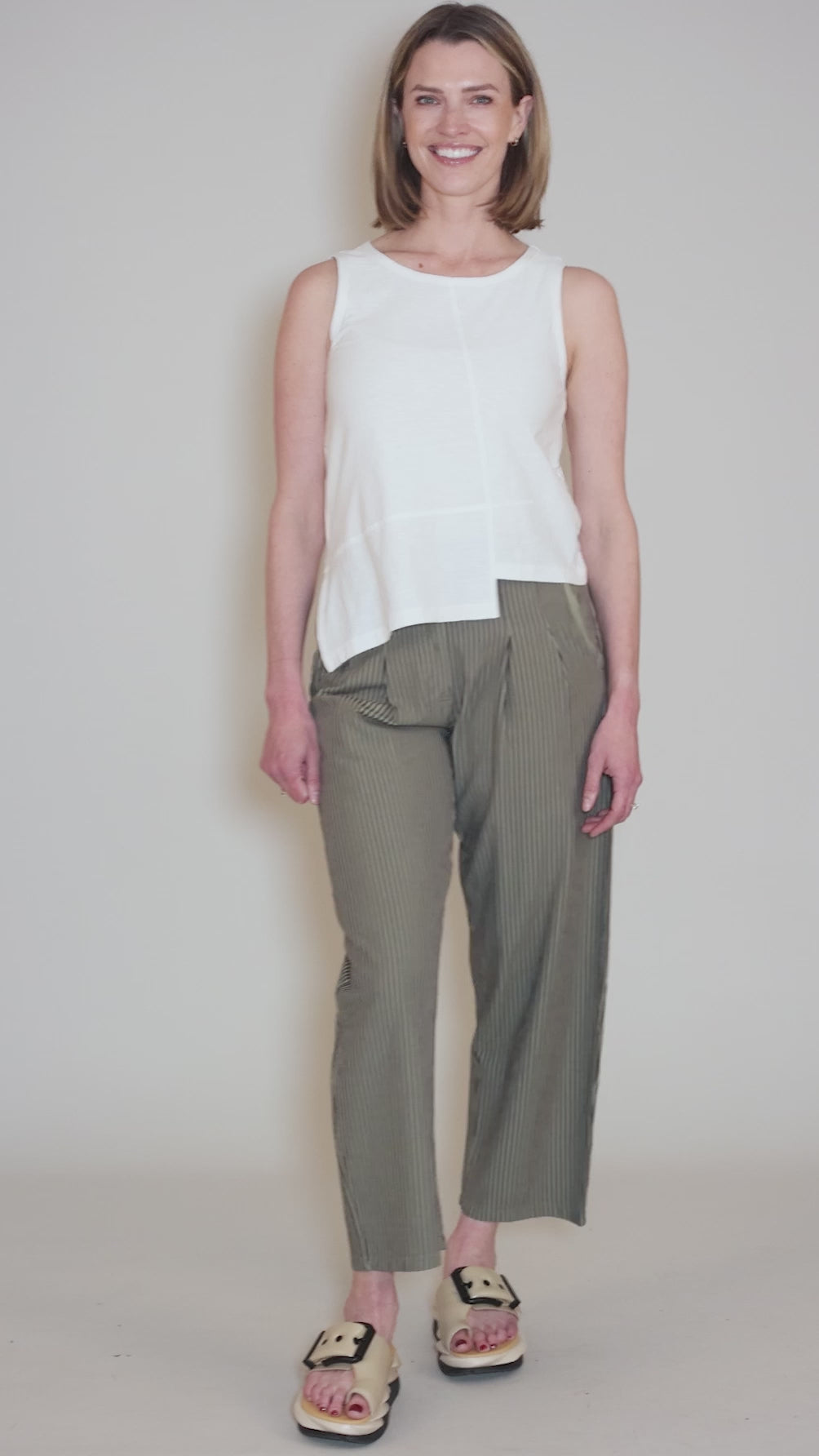 Made in a cotton slub knit, this trim tank has a rounded neckline and overlocked stitch details throughout. The hemline is notched and shifted. We find this is runningĀ a bit on the small side.