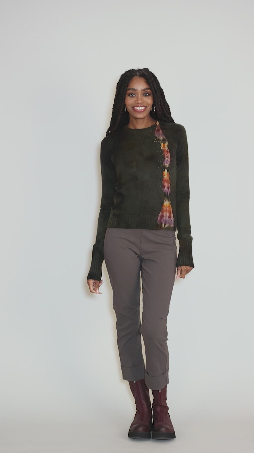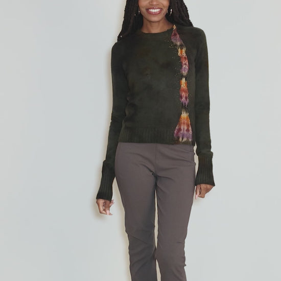 In a word: stunning. Galadriel Mattei, an eco-friendly luxe line out of Los Angeles, hand-dyes and hand-finishes each of her cashmere sweaters to spectacular effect. This more tailored pullover has a crew neckline, a set-in shoulder and a not-too-tight fit. Please note that, due to the hand-crafted nature of these sweaters, no two will be exactly alike.