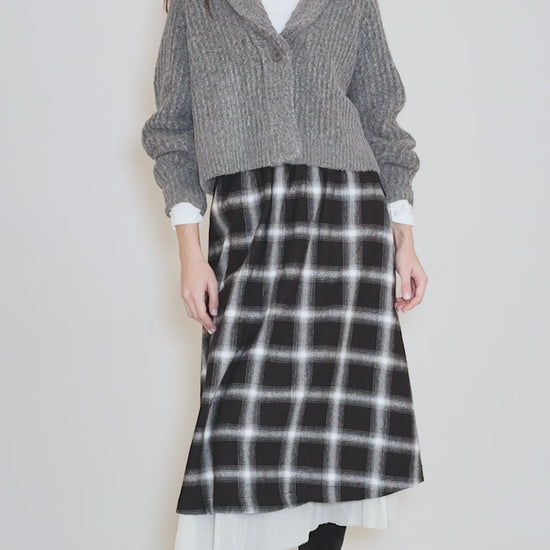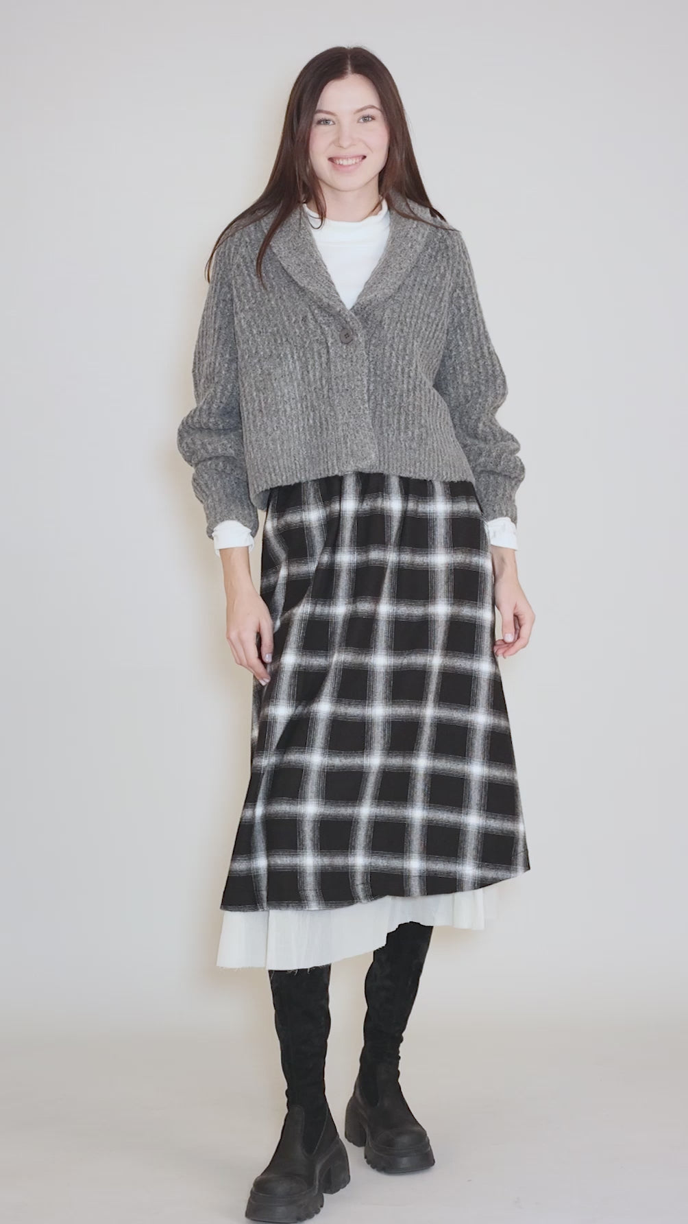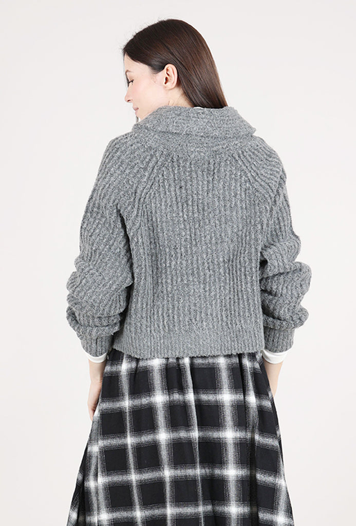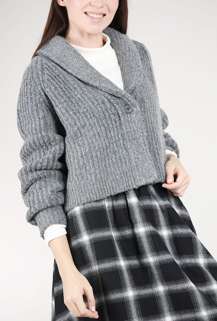 The knit here is quite substantial, a soft acrylic blend with a lofted texture. The cardie has full balloon sleeves that cuff at the wrists, with a shawl collar and a single-button closure at the bust. Running a bit on the large side.