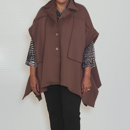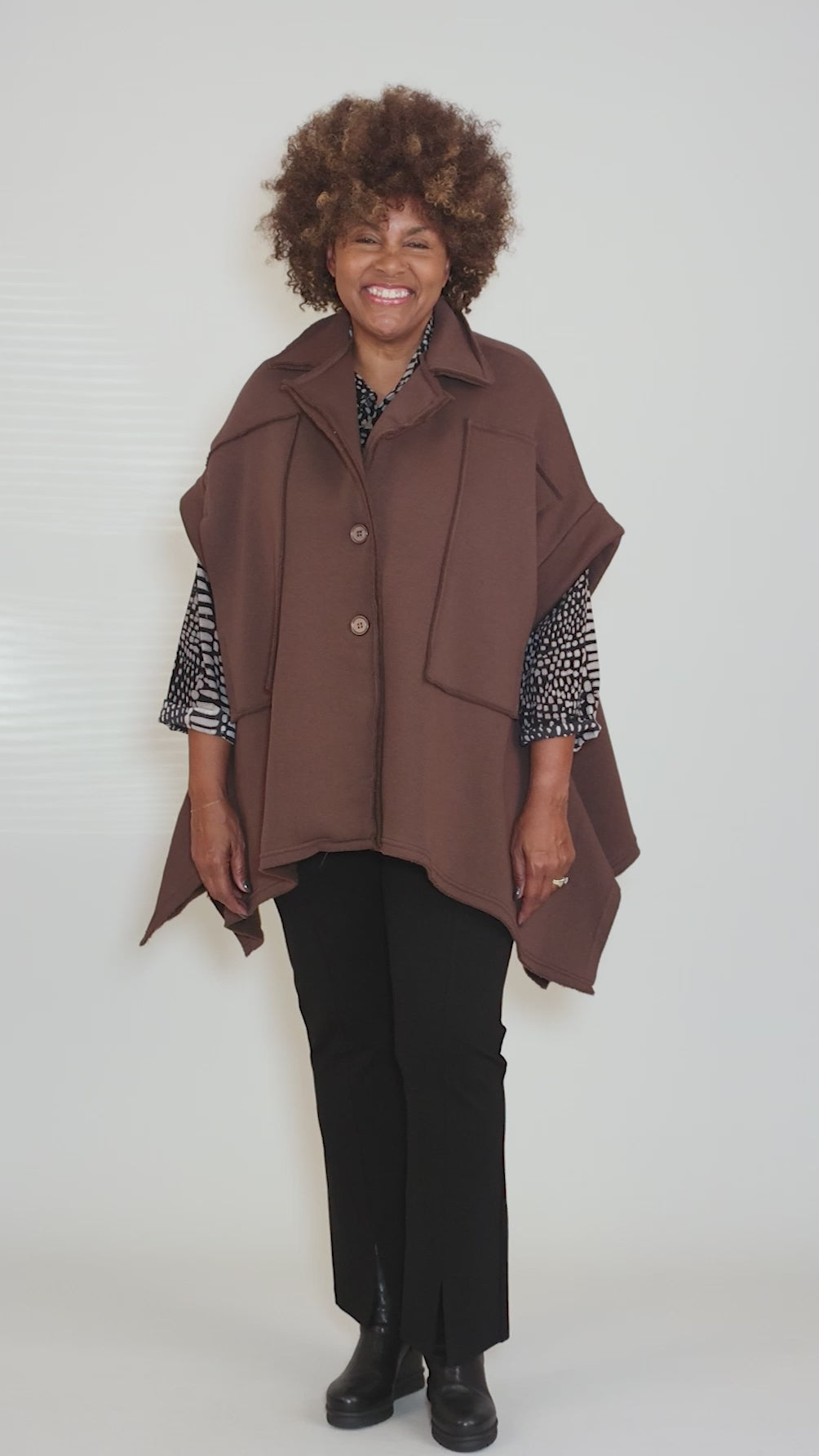A kicky update on the classic pea coat, this cutie is made in a VERY substantial, very soft cotton fleece. It has a drop-shoulder construction, with short sleeves and a button-front placket. The hemline is dramatically uneven, with a relaxed fit.