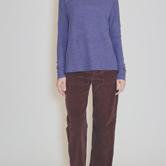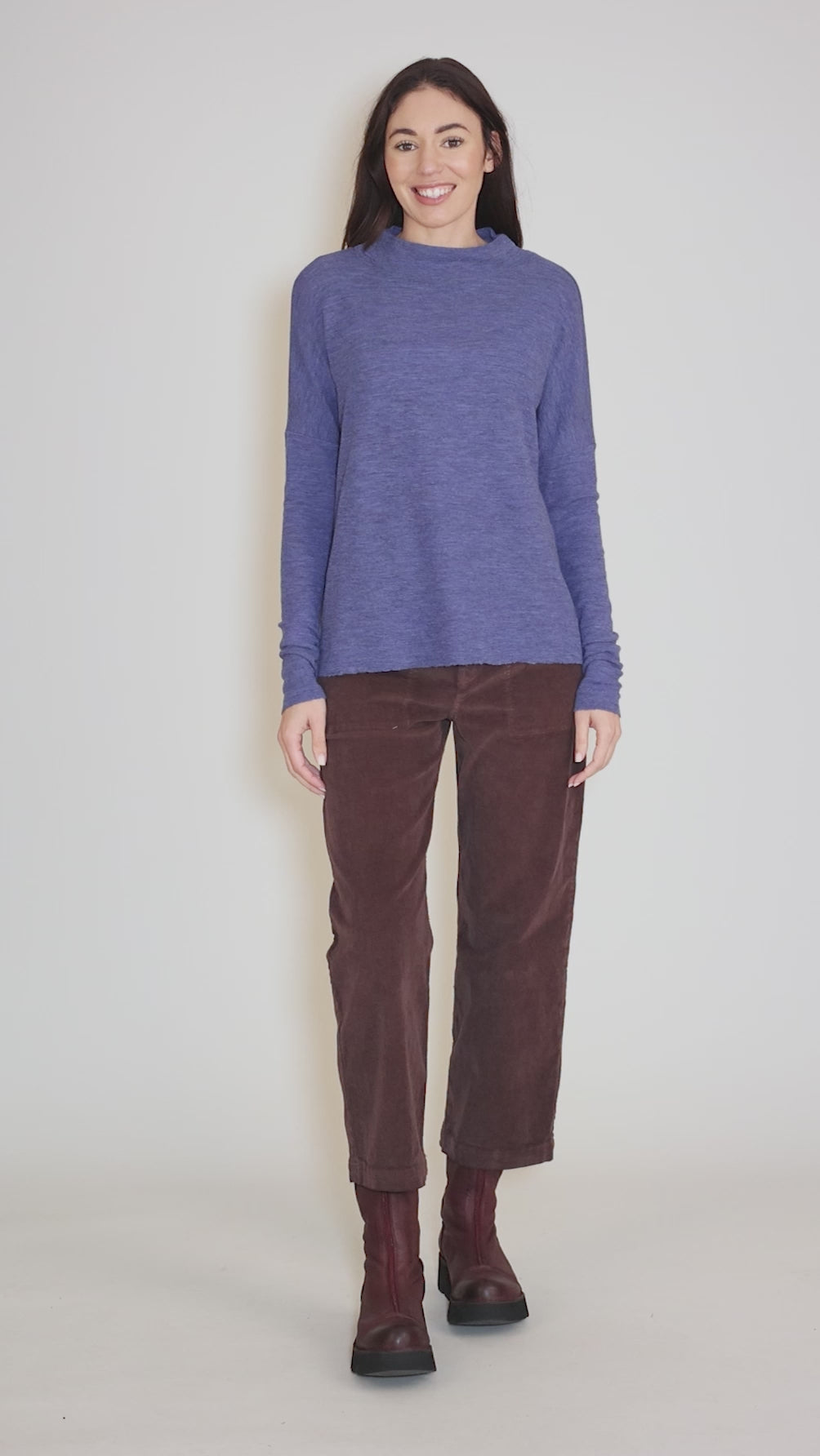 Made in a soft Merino wool, this easy sweater has a short funnel neckline, a drop-shoulder construction and bracelet-length sleeves. The fit is deliberately boxy -- but not hugely oversized! -- with a versatile, hip-skimming length.