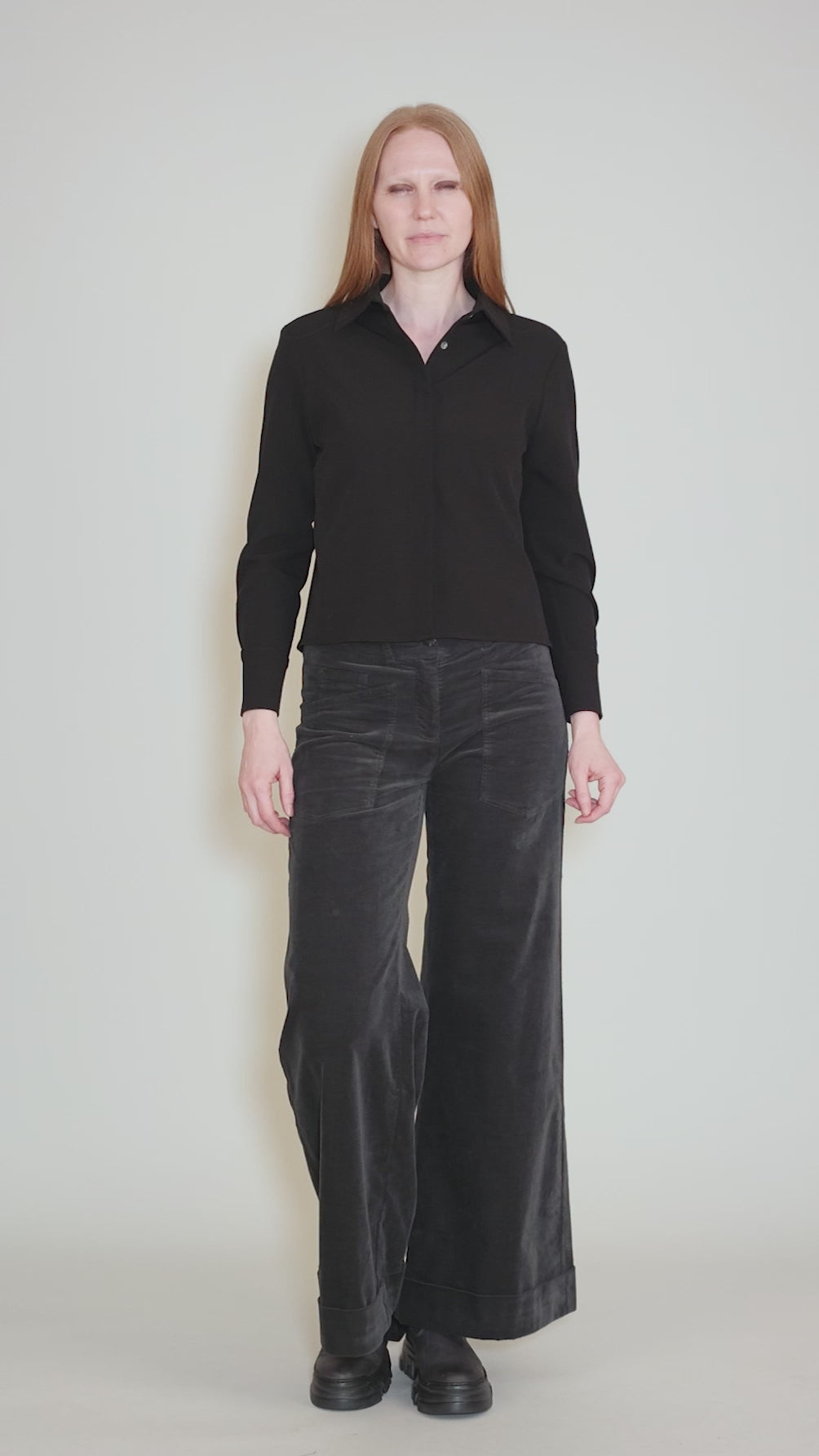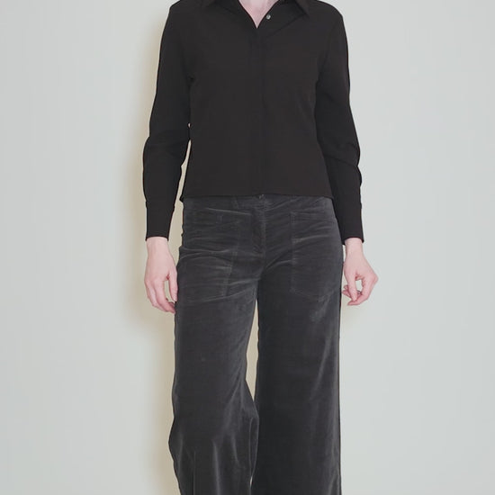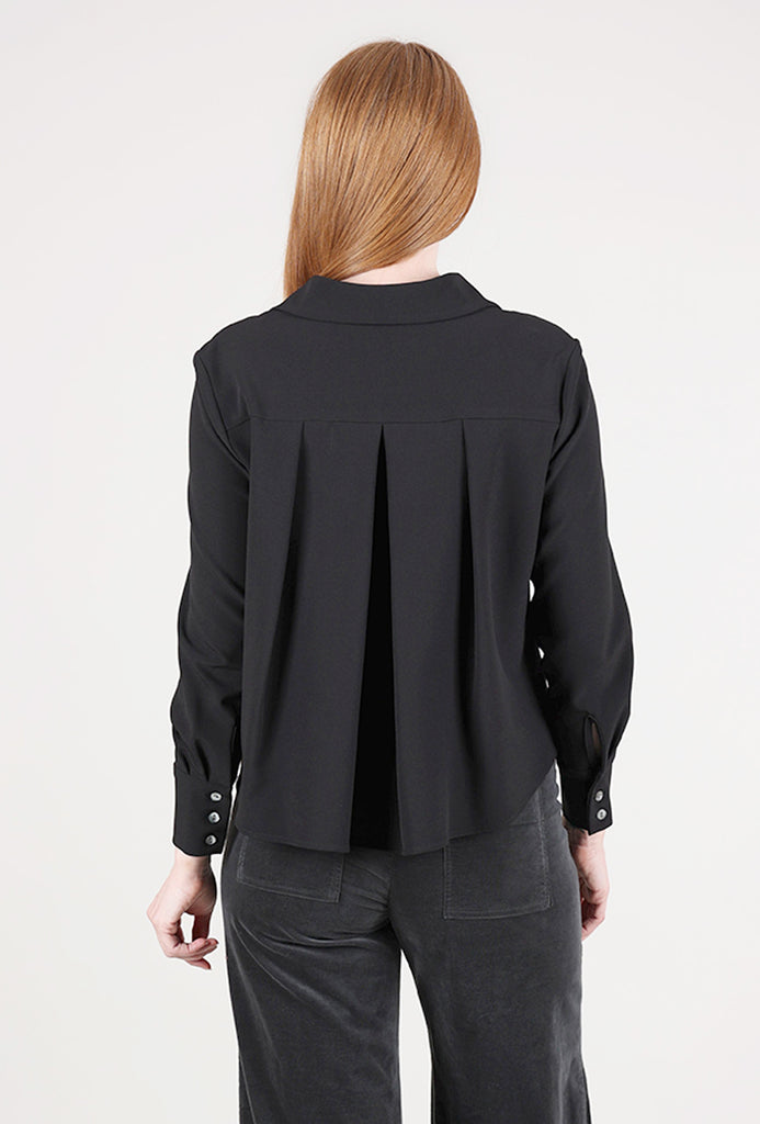 Crafted in a mid-weight poly blend with gorgeous drape, this relaxed piece has a set-in shoulder, with a small shirt collar and a hidden button placket in front. The body is an easy A-line; inverted pleats in back add swing to the look. This is a shorter version of Estelle & Finn's best-selling Pleat-Back Blouse.