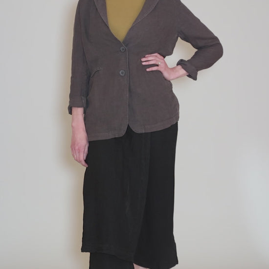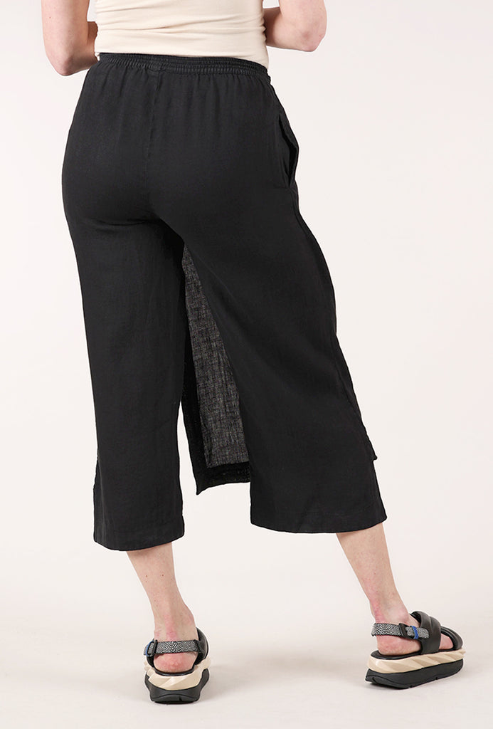We're loving this hybrid bottom! This piece features an asymmetrical linen panel that creates a skirt effect as it buttons over a straight-legged linen pant. A patch pocket and a flat elastic waistband add to its ease of wear. Running a bit on the small side.