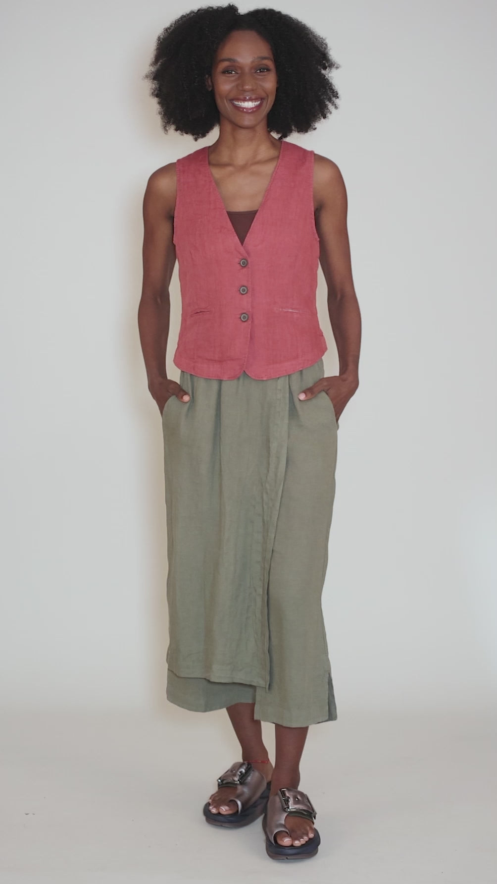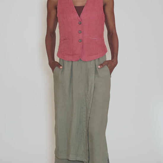 We're loving this hybrid bottom! This piece features an asymmetrical linen panel that creates a skirt effect as it buttons over a straight-legged linen pant. A patch pocket and a flat elastic waistband add to its ease of wear. Running a bit on the small side.