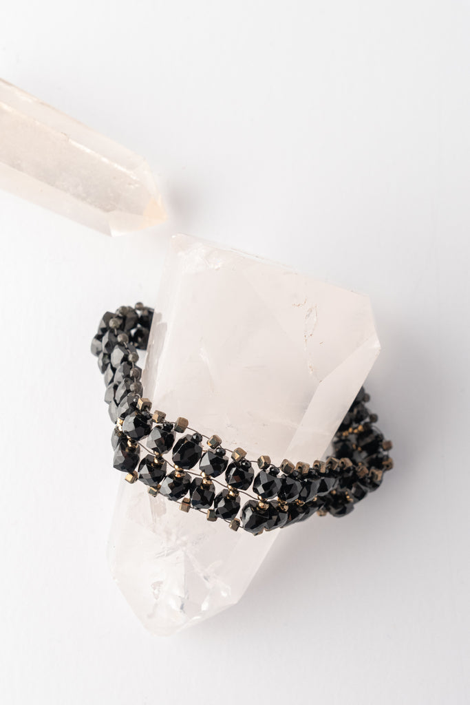 Bold, fluid, and endlessly wearable, this bracelet adds an instant dose of modern glamour. A shimmering row of faceted black onyx beads is paired with hematite accents, creating a luxe, slinky drape around the wrist. The alternating textures catch the light beautifully, making it perfect for day-to-night styling. Finished with rich metallic detailing, this piece brings both edge and elegance to any jewelry collection.