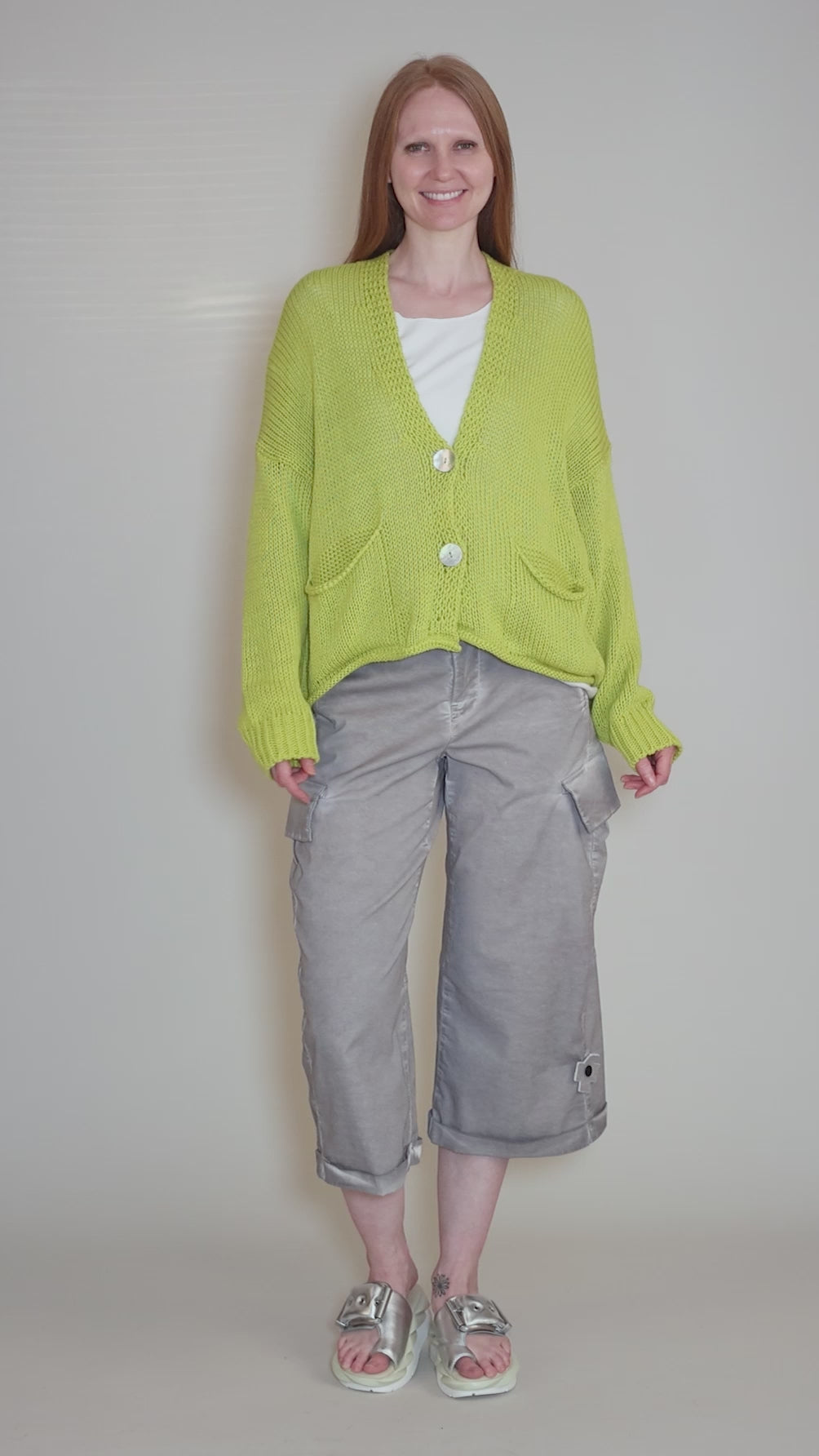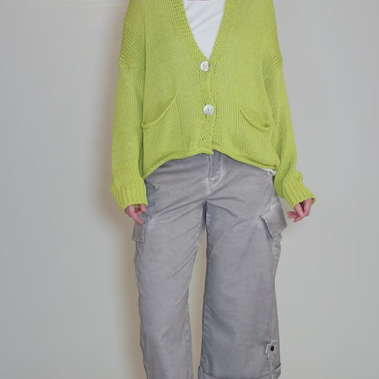 The quintessential oversized grandpa cardigan, this striking piece has extra-long dolman sleeves, a deep V neckline and a button placket in front. The silhouette is slightly cropped, and twin pockets sit at the hip. It's loosely knit in a soft cotton blend.