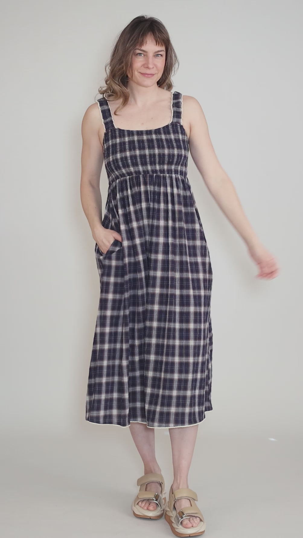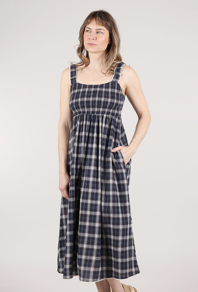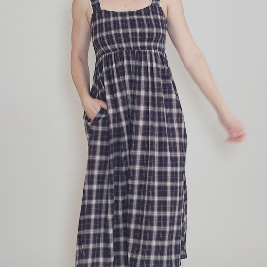 Smocked Plaid Midi Dress, Midnight