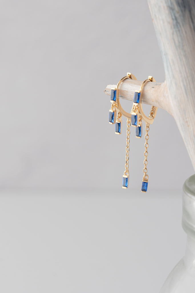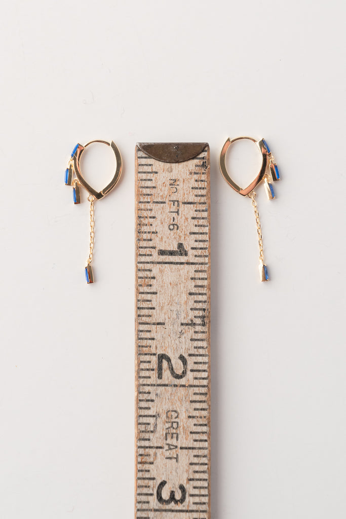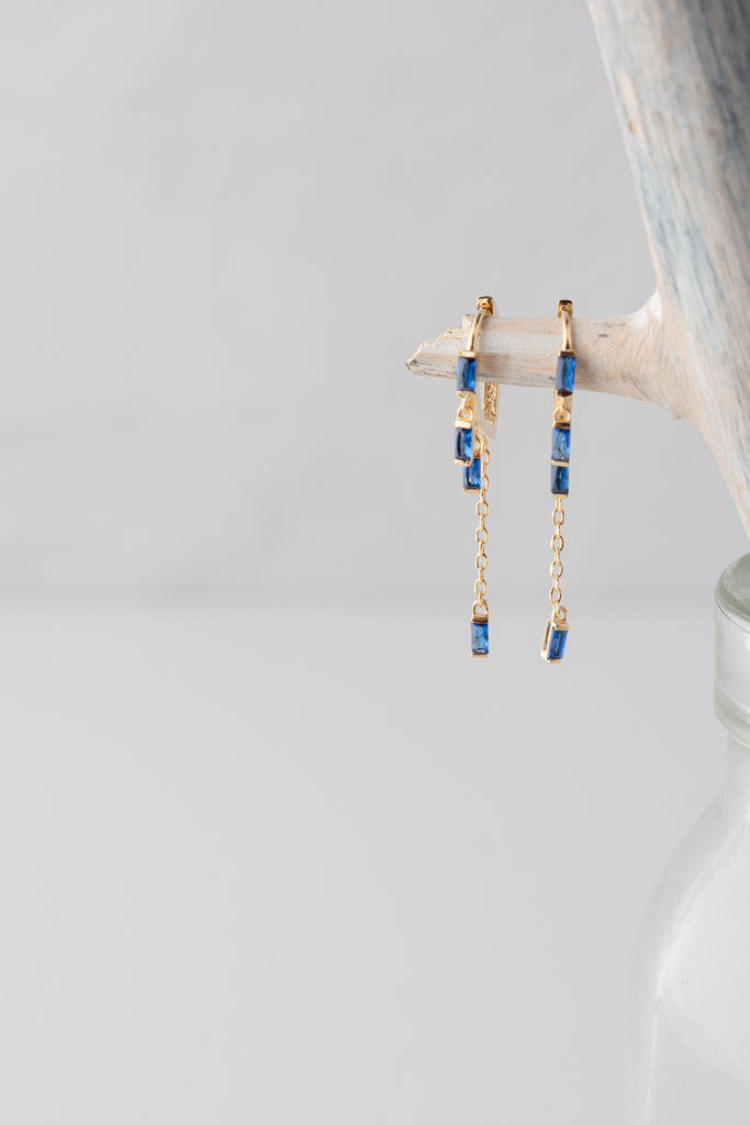 Our tiniest huggies, crafted from high-quality 14K gold vermeil and set with sparkling cubic zirconia, bring a vibrant pop of color to your ear stack. Each hoop features four dangling blue sapphire cubic zirconia baguettes, along with an elegant, delicate drop chain that adds extra shimmer and movement. So cute for everyday wear or as a striking addition to your ear game.