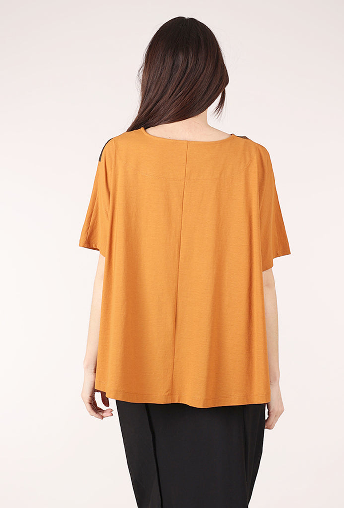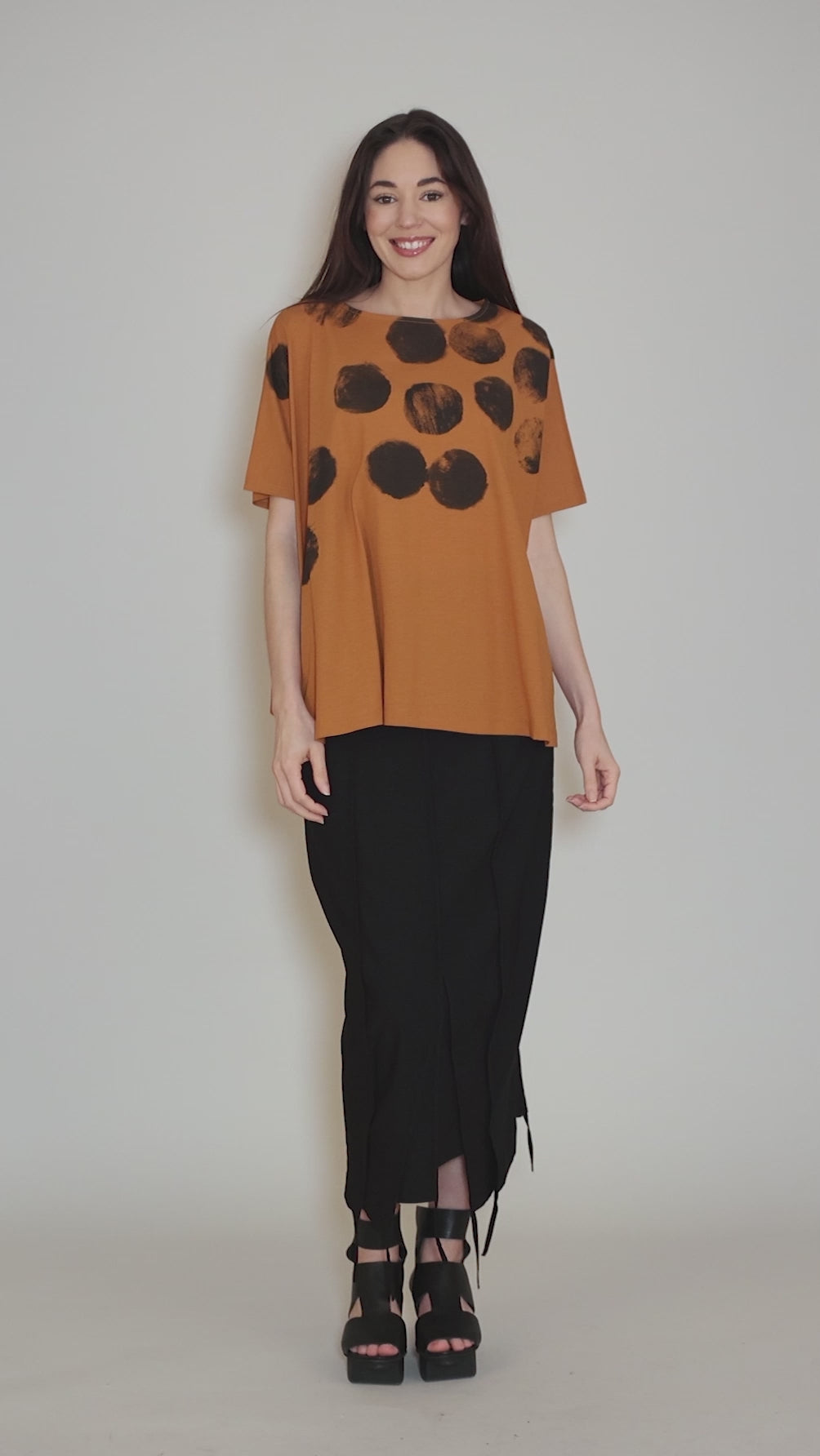 Done in a mid-weight cotton jersey, this hand-screened tee has a wide, shallow neckline; long sleeves; and an easy, boxy silhouette. The hemline is asymmetric. The fit is quite relaxed, though not nearly as oversized as many Moyuru pieces.